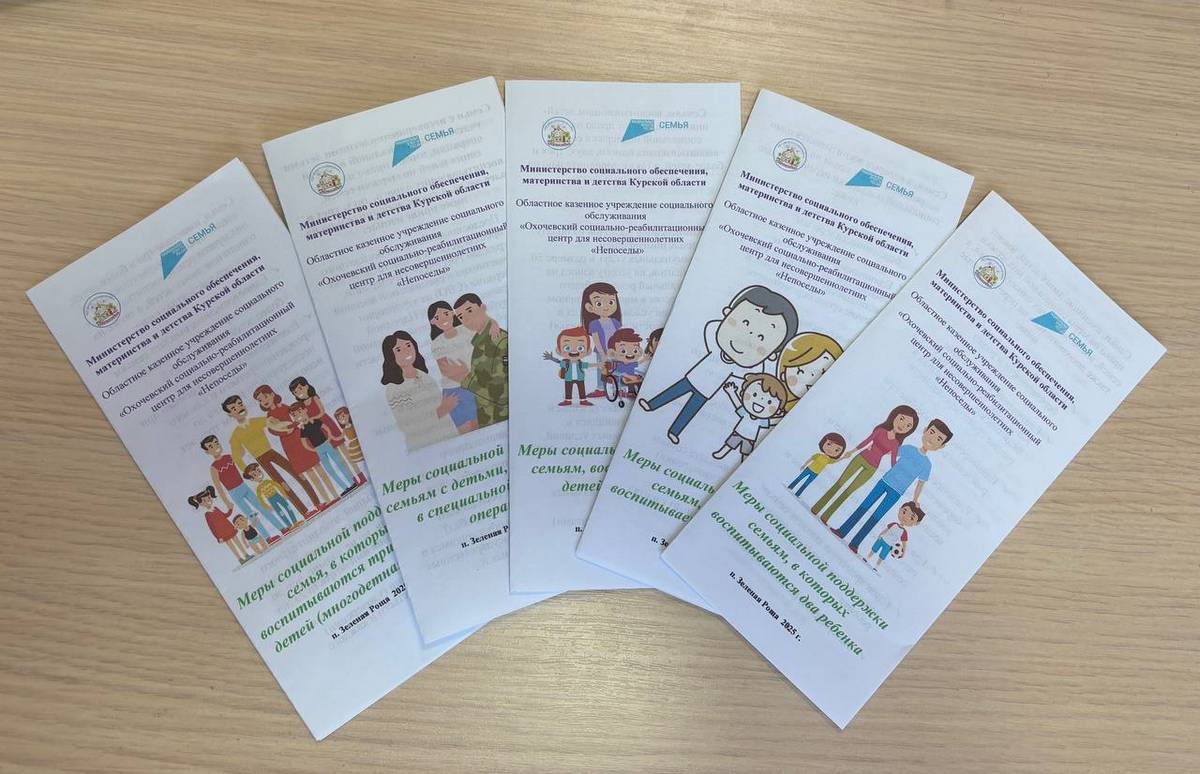 5 видов информационных буклетов для родителей в рамках национального проекта «Семья» разработано специалистами ОКУ "Охочевский социально-реабилитационный центр "Непоседы", которые содержат информацию о том, на какие конкретные меры социальной поддержки имеют права разные категории семей в Курской области.