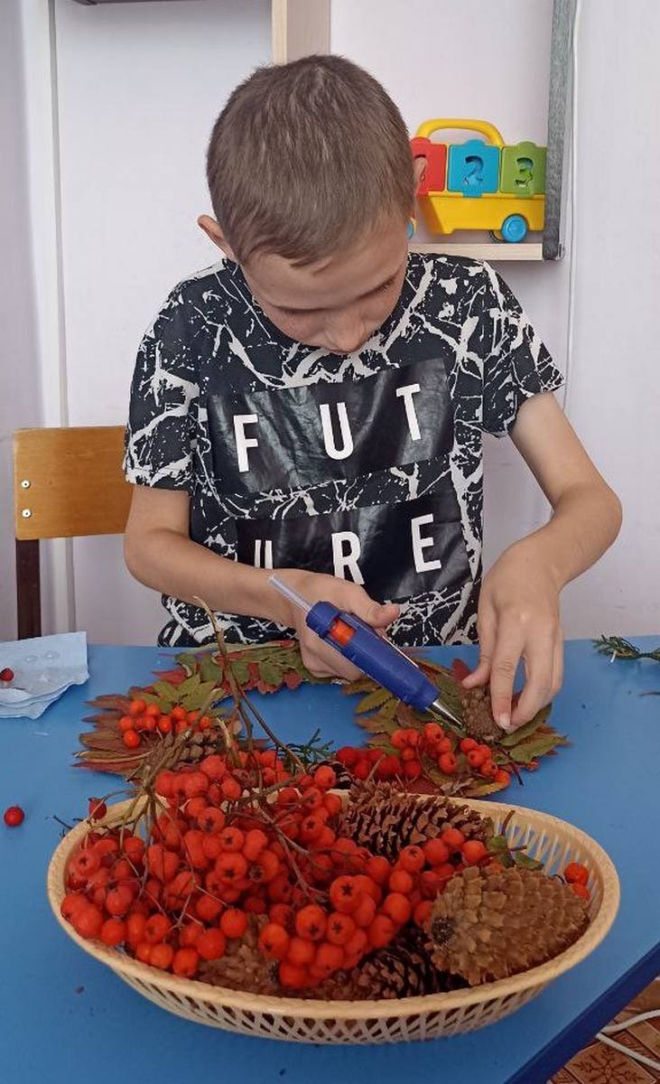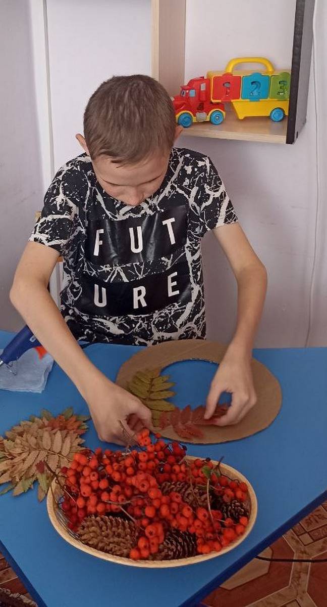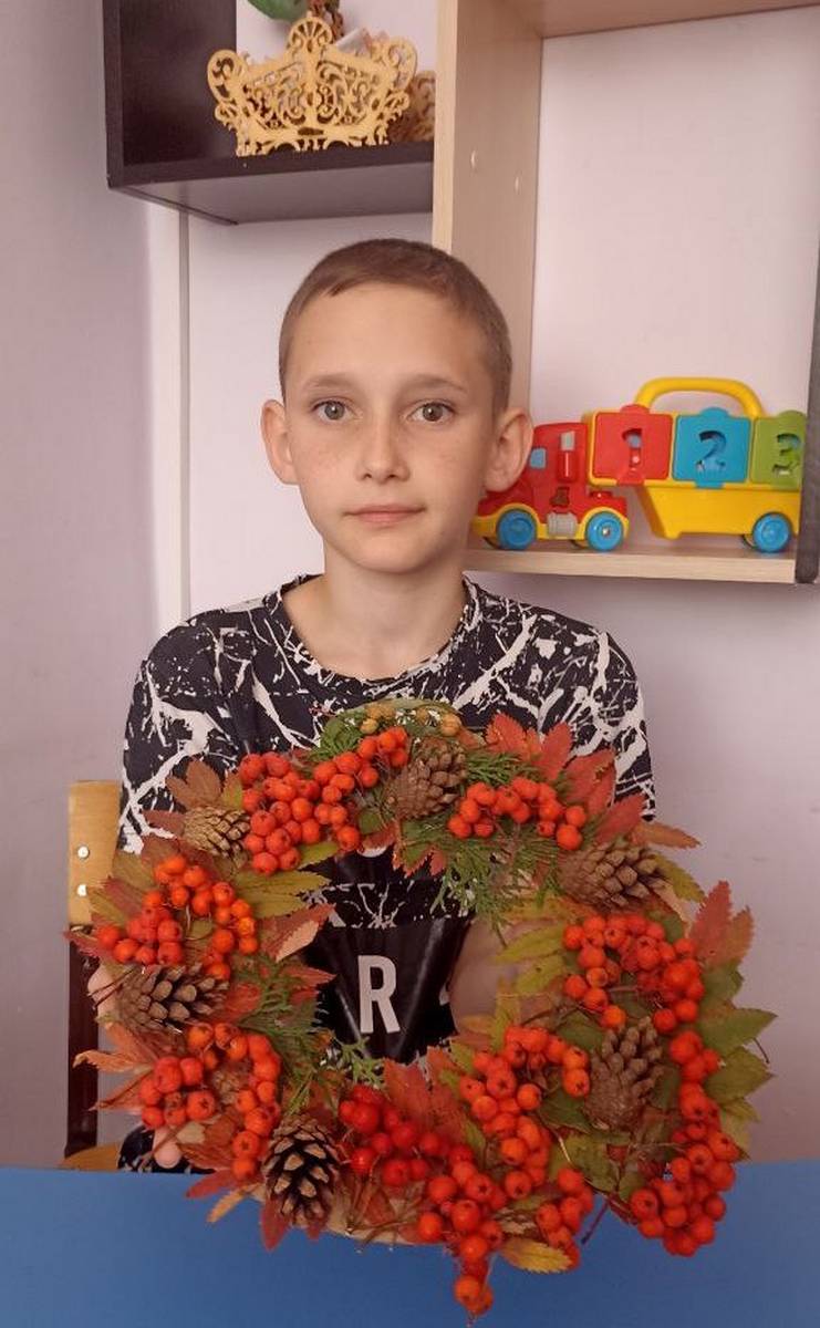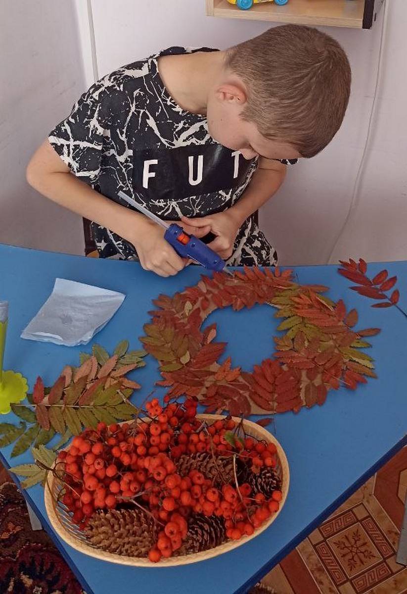 Наступила осень, преобразив мир вокруг в калейдоскоп красок. Деревья, словно по волшебству, "оделись" в разноцветные наряды, радуя нас своим великолепием. Процесс изготовления оказался увлекательным и творческим. Воспитанник Богдан с энтузиазмом принялся за дело, вырезая из картона основу для венка и аккуратно приклеивая к нему природный материал. Венок получился уникальным, отразив индивидуальность и творческий подход ребёнка.