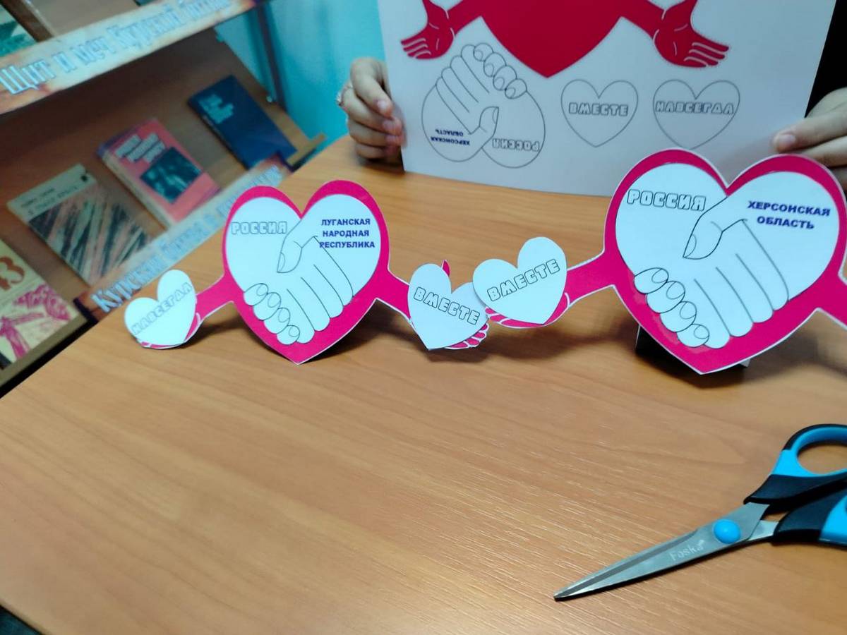 В преддверии важного государственного праздника - Дня воссоединения Донецкой и Луганской Народных Республик, Запорожской и Херсонской областей с Россией - совместно с библиотекарем Охочевской модельной библиотеки для воспитанников "Охочевского центра "Непоседы " было проведено мероприятие "Одна страна, одна семья, одна Россия".