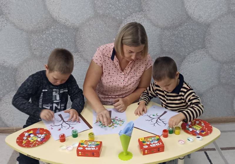 Скомкав фольгу в небольшие шарики, ребята принялись раскрашивать яркими красками осеннее дерево. Дети восприняли весь процесс создания композиции как волшебство, увлекательную игру с магическим эффектом возникновения картины. Комочек фольги даёт красивую рваную структуру отпечатка, что идеально подходит для изображения кроны осенних деревьев. Работы получились яркими, воздушными и уникальными.
