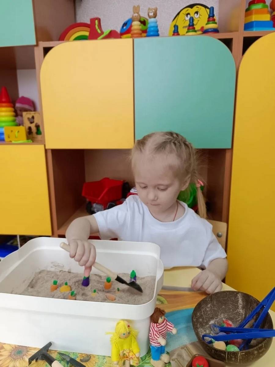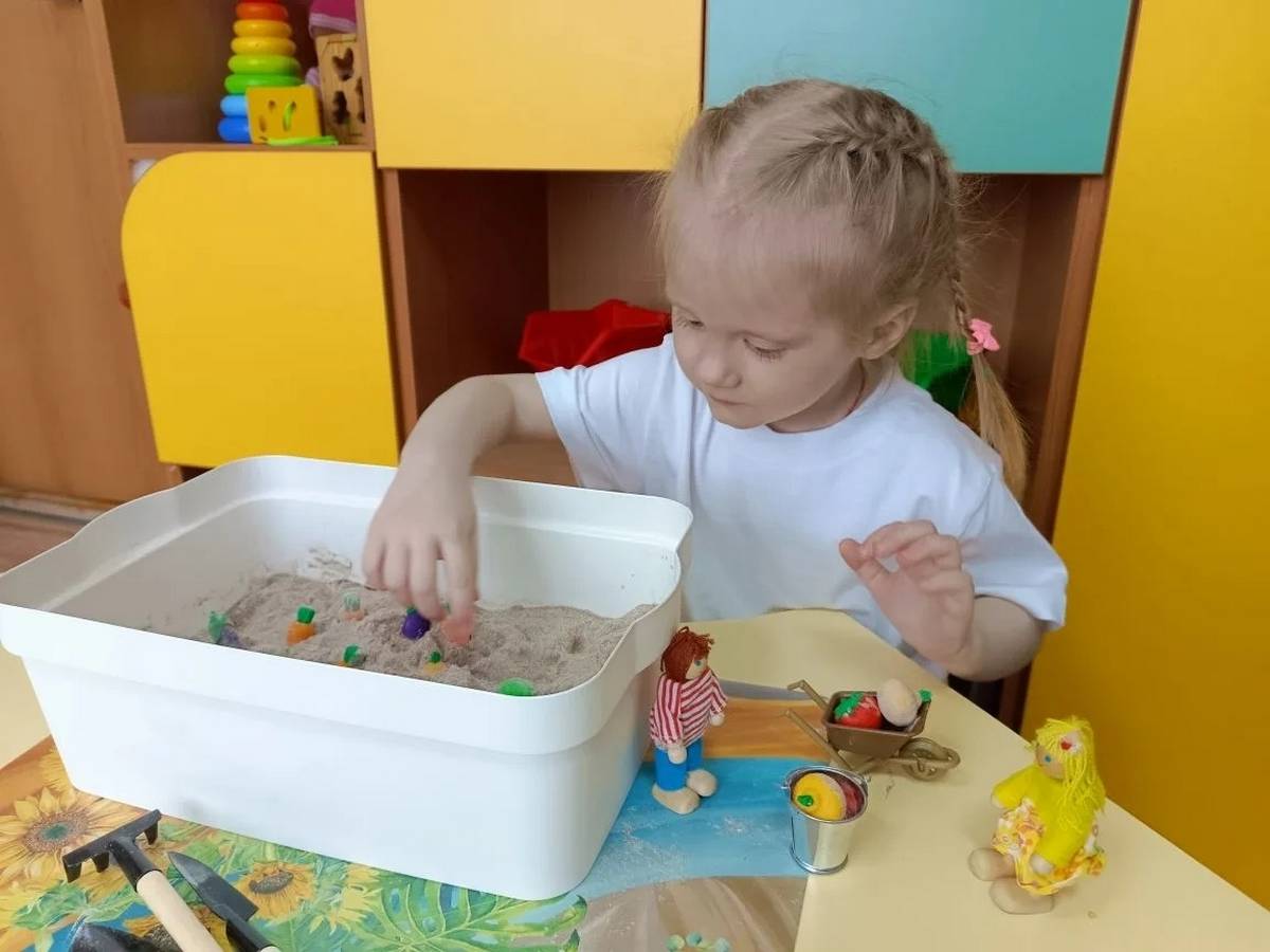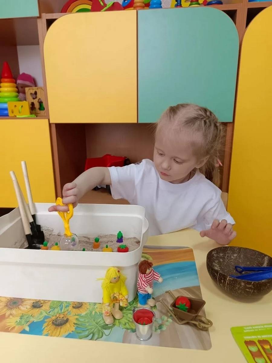 На занятии «Сенсорная коробка «Мы сажаем огород» педагог-психолог предложила воспитаннице воссоздать в игровой форме процесс выращивания овощей на огороде. Девочка с интересом выполняла задания, с удовольствием играла и взаимодействовала с педагогом.