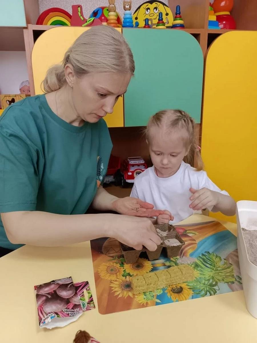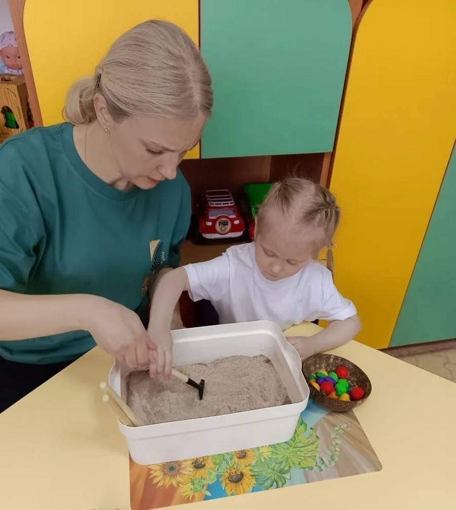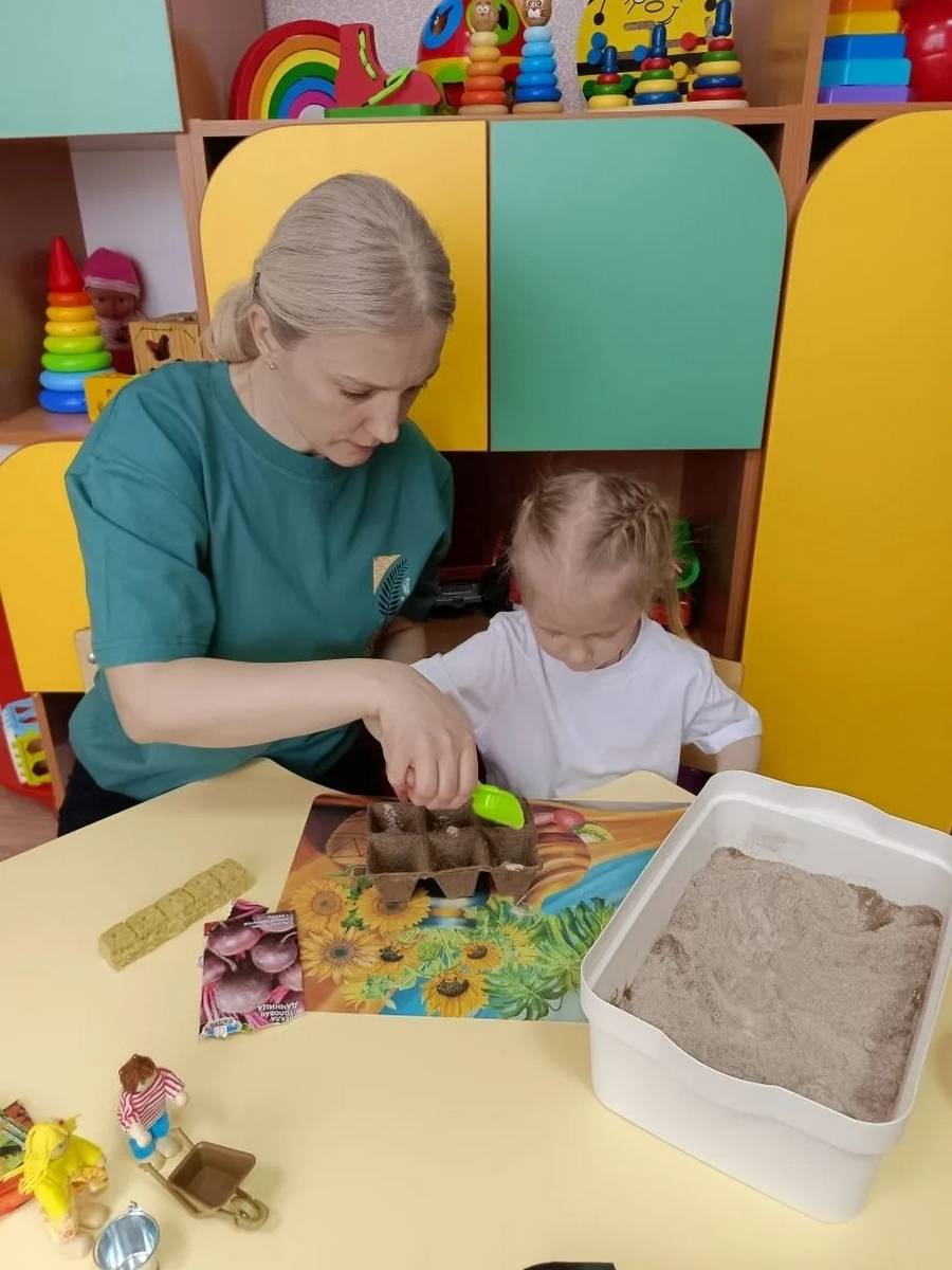 На занятии «Сенсорная коробка «Мы сажаем огород» педагог-психолог предложила воспитаннице воссоздать в игровой форме процесс выращивания овощей на огороде. Девочка с интересом выполняла задания, с удовольствием играла и взаимодействовала с педагогом.