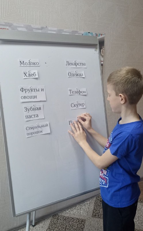 Цель данного мероприятия – обучение воспитанников финансовой грамотности. Вместе с воспитателем Сочивец М.А. дети в игровой форме изучали основы финансовой грамотности, принципы правильного отношения к деньгам. В ходе занятия ребята искали ответы на вопросы: как правильно составить список покупок; как не потратить лишнего и купить всё необходимое; на что нужно обращать внимание у полок с товаром; какие правила поведения нужно соблюдать в магазине. Воспитанникам было предложено разделить товары на две группы: в первую поместить товары, которые необходимы человеку, а во вторую – товары, которые желаемы, но без них можно обойтись. Вместе с ребятами была составлена памятка для покупателя.