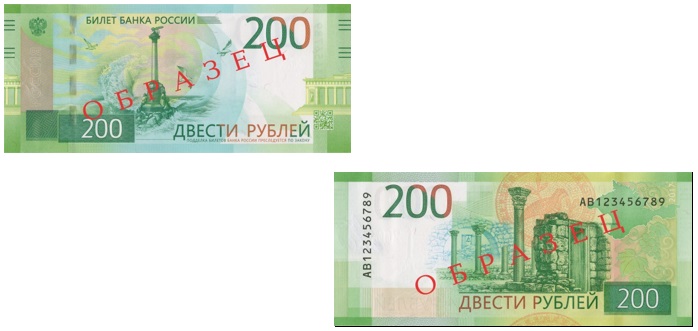 На банкноте, основной цвет которой – зеленый, размещены символы Севастополя. На лицевой стороне – изображение памятника затопленным кораблям, на оборотной – вид на Херсонес Таврический. Банкнота в 200 рублей отпечатана на хлопковой бумаге повышенной плотности с полимерной пропиткой. Как отмечают специалисты Гознака, это обеспечит ее высокую износостойкость и продлит срок обращения в полтора раза.