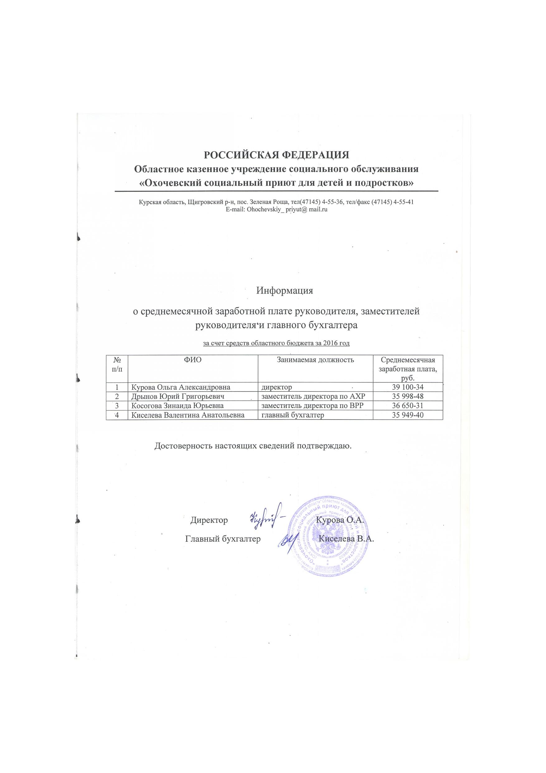 Информация о среднемесячной заработной плате руководителя, заместителя руководителя и главного бухгалтера за 2016 год