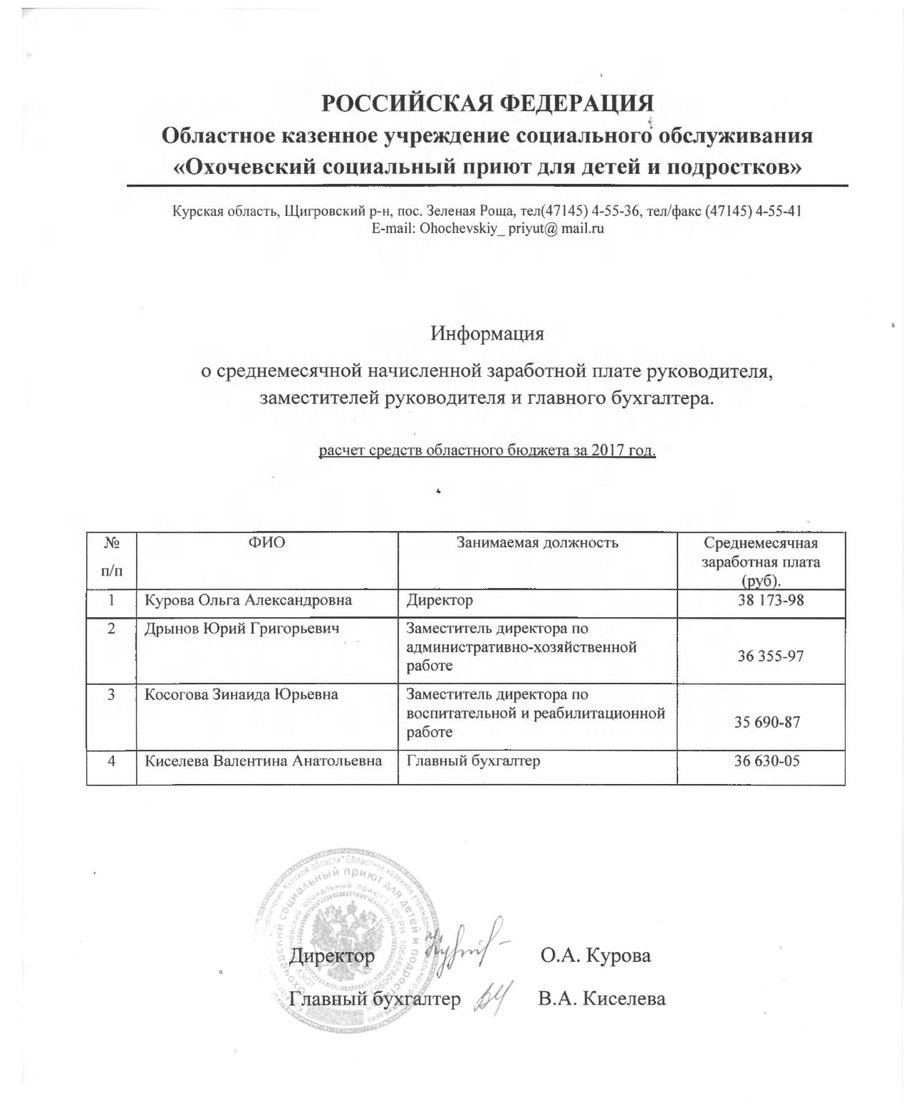Информация о среднемесячной заработной плате руководителя, заместителя руководителя и главного бухгалтера за 2017 год