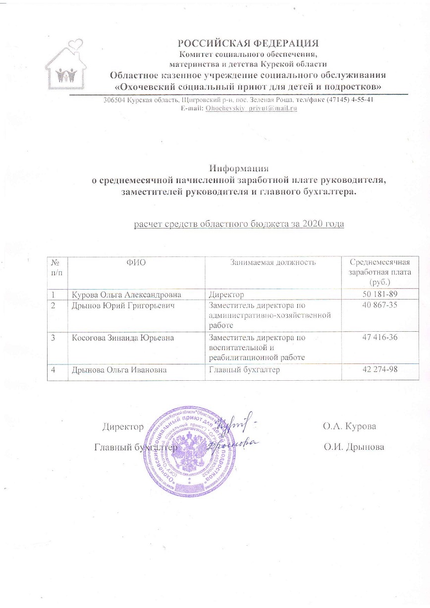 Информация о среднемесячной заработной плате руководителя, заместителя руководителя и главного бухгалтера за 2020 год