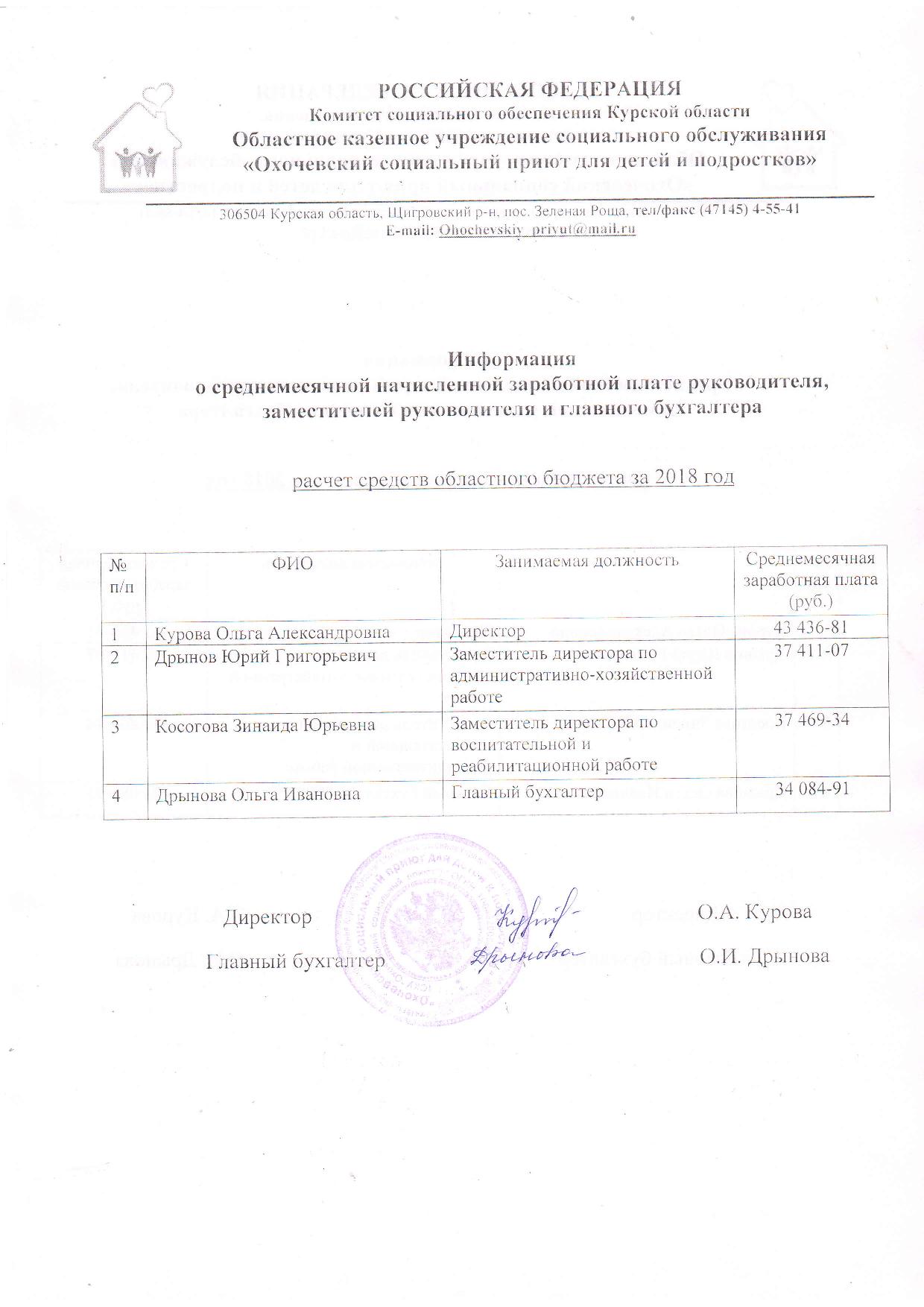 Информация о среднемесячной заработной плате руководителя, заместителя руководителя и главного бухгалтера за 2018 год