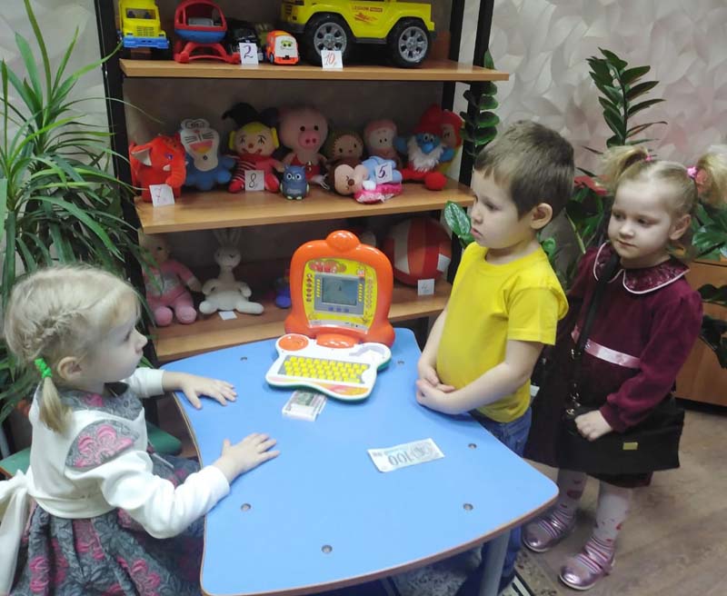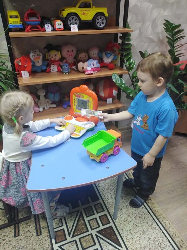 Цель которой: формирование умений использовать полученные знания о финансовых понятиях (покупка, продажа , расход , доход), бережное отношение к деньгам, знакомство с профессией продавца. Игра детям очень понравилась. С покупками, приобретенными в магазине, они играли с удовольствием.