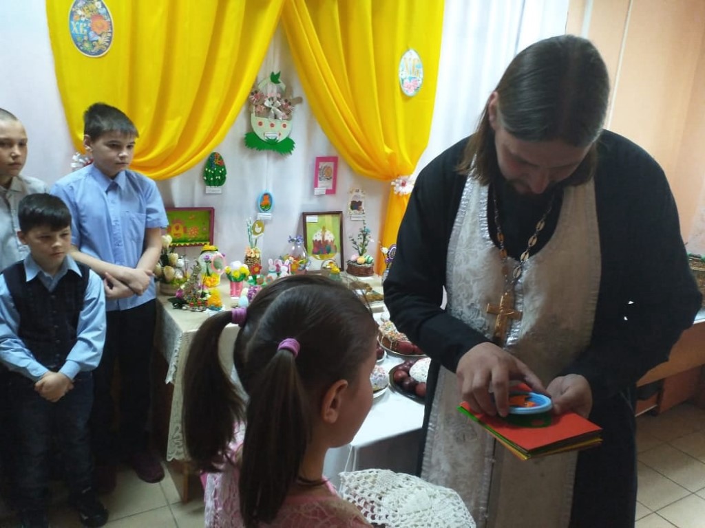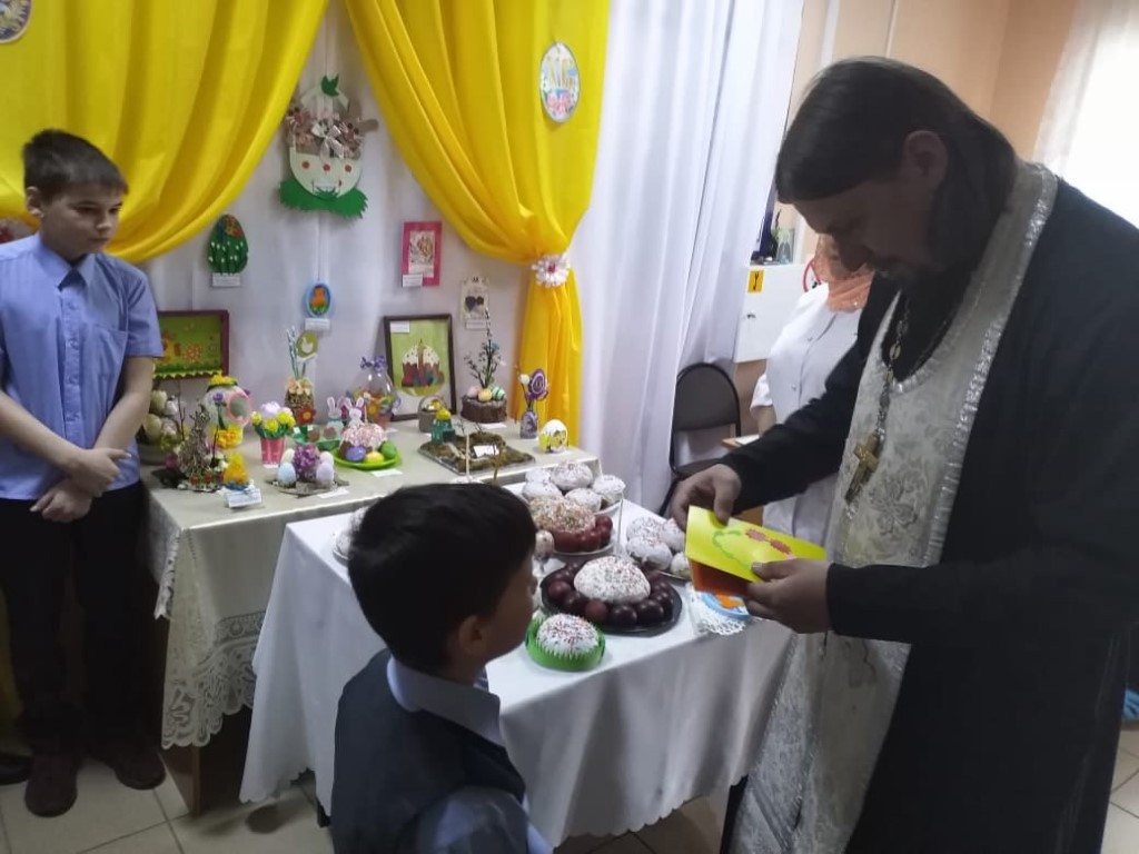 Наши дети, в свою очередь, подготовили для гостя подарки: открытки, Пасхальный кулич, приготовленный своими руками, праздничный сувенир и слова благодарности.