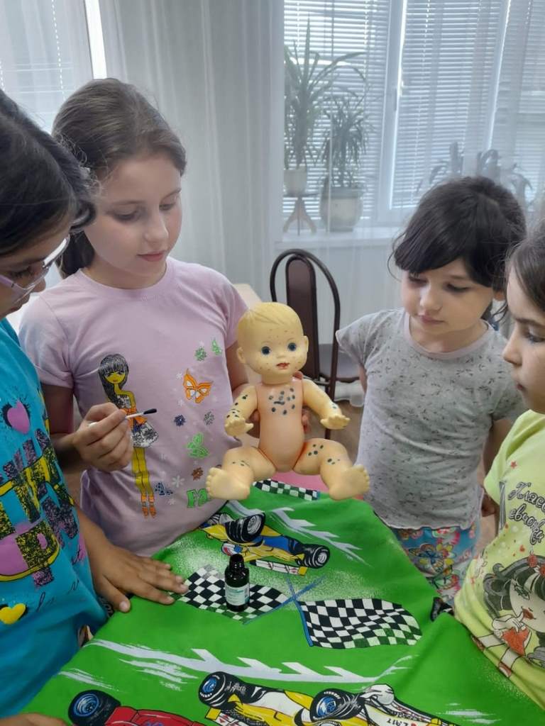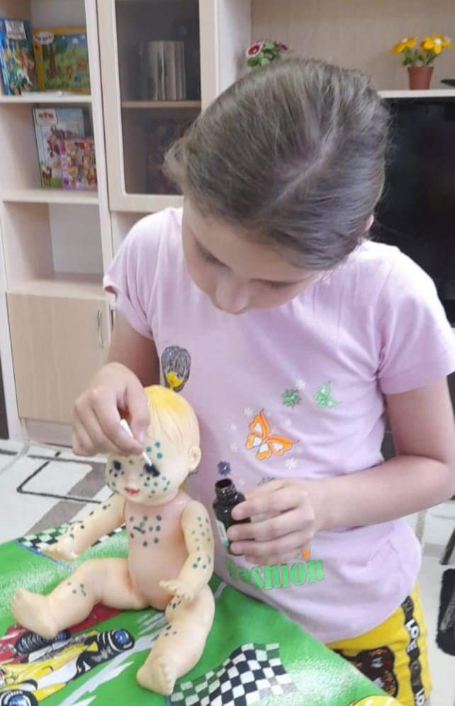 На практике дети уяснили, для чего обрабатывают зелёнкой сыпь и поучились точечно обрабатывать прыщи.