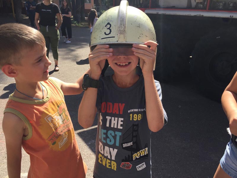 Дети с удовольствием разглядывали пожарные машины, а некоторые, примеряя шлем, решили стать пожарными.