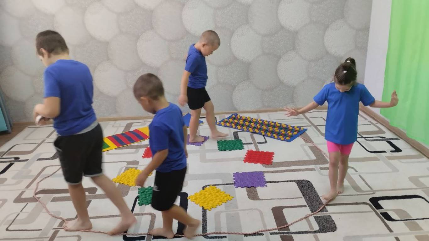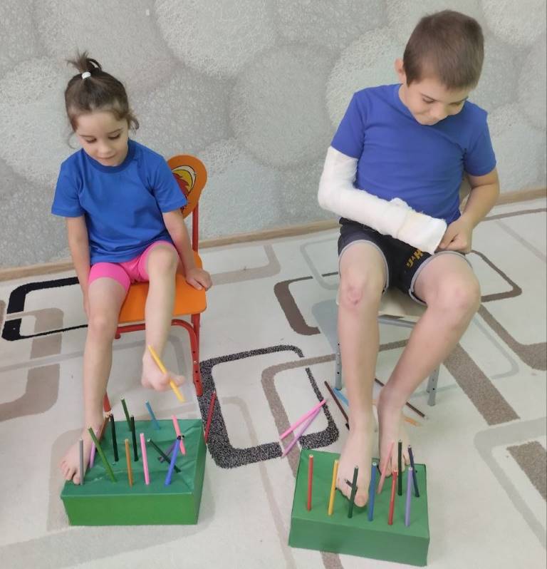 В ОКУ «Центр «Непоседы» педагог-психолог Тимохина Л.В. и музыкальный руководитель Голенищева С.А. провели занятие «Игры для босых ног». Под музыку воспитанники выполняли различные упражнения для ног: ходили по массажным квадратам, учились захватывать ногами мелкие игрушки, салфетки и перемещать их в кольцо, мять ножками комочки; играли пальчиками ног с цветными карандашами.