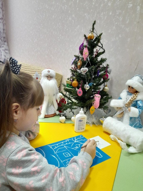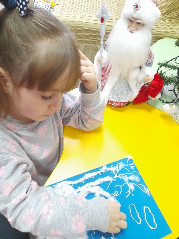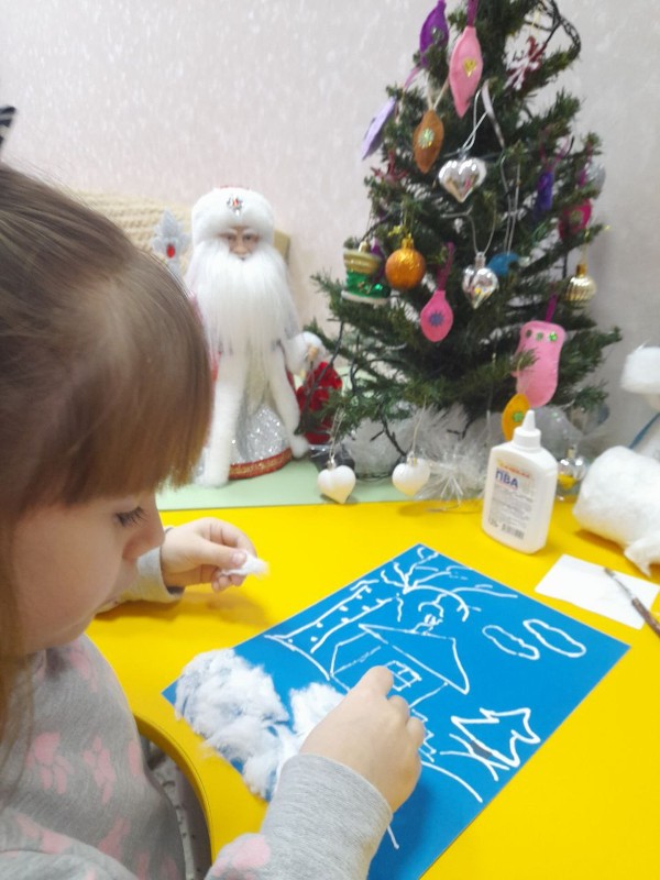 В ОКУ "Охочевский центр "Непоседы" продолжает работу творческая мастерская "Золотые ручки". За окном идет пушистый снег, и на занятии воспитанница постаралась изобразить зимний пейзаж, сделав объемную аппликацию из ваты. Девочка очень старалась, и в результате получилось красивое панно.
