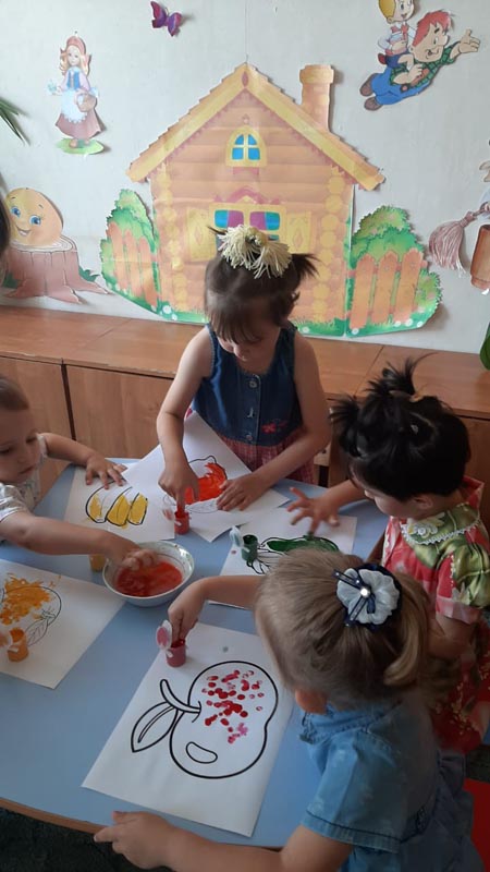 В игровой форме закрепили представления детей об основных способах укрепления и сохранения здоровья (утренняя гимнастика, прогулка на свежем воздухе, польза овощей и фруктов), закрепили навык рисования " тычком".
