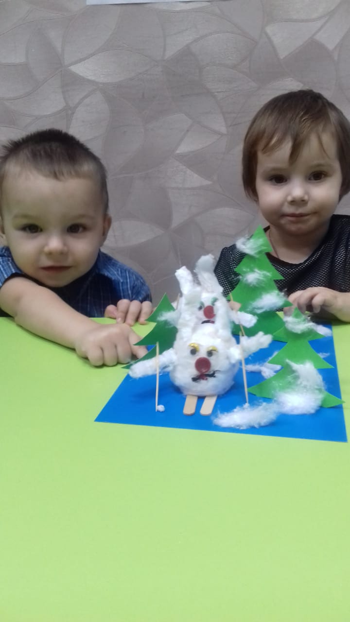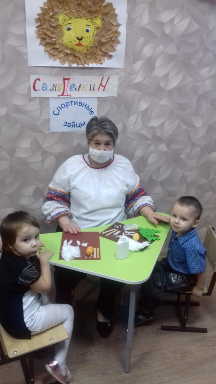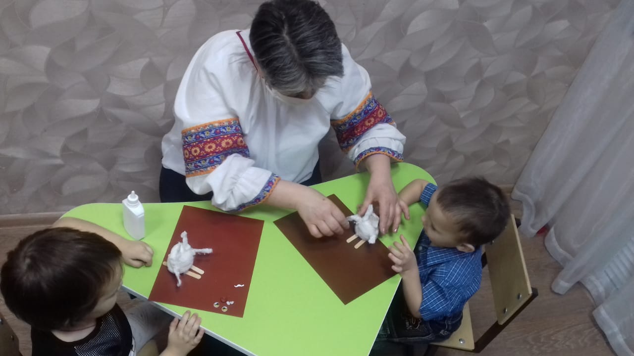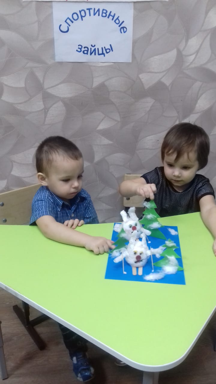 Воспитатель Булавинова В.А выполнила с детьми кружковую работу с маленькими детьми на тему "Спортивные зайцы". Целью этой работы было научить детей пользоваться клеем, бумагой, ватой. Наши малыши с удовольствием выполняли поделку с помощью воспитателя. Им было очень интересно и познавательно.