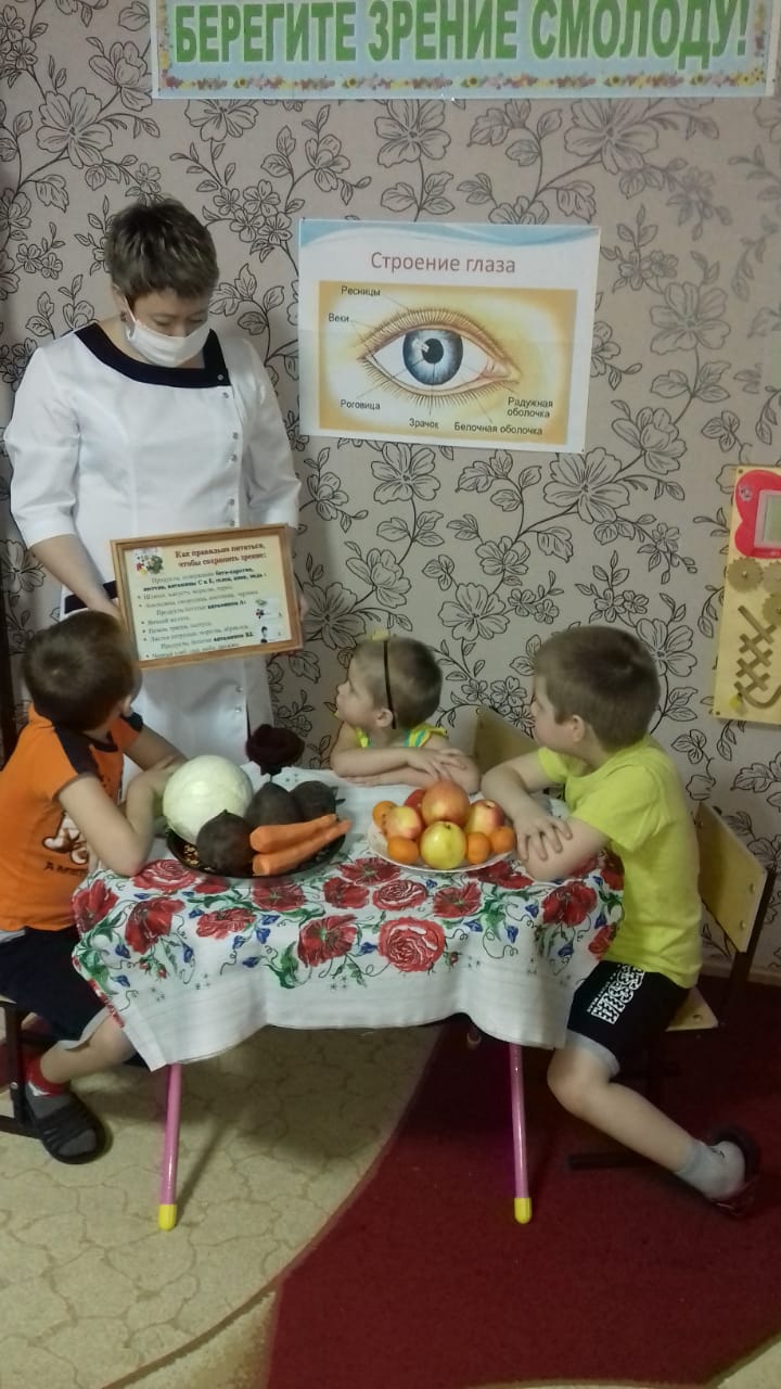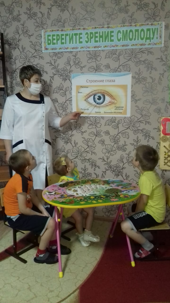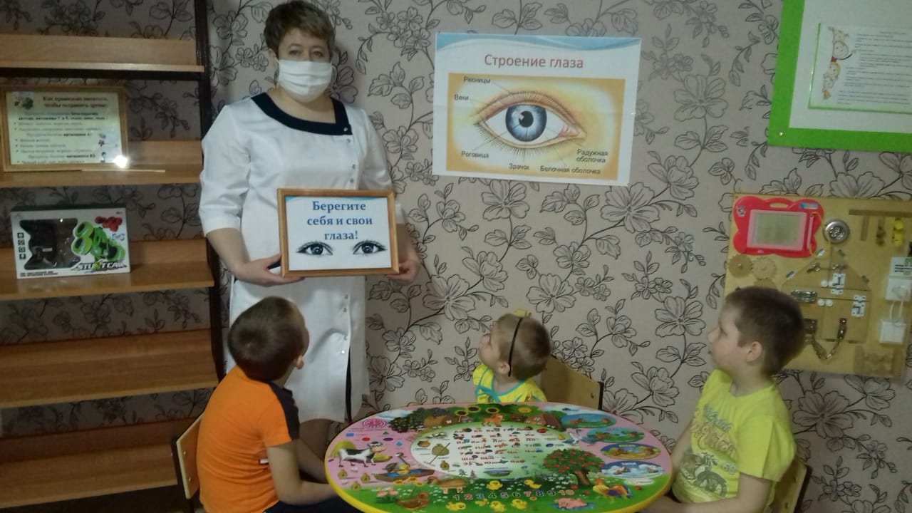 18 января медицинская сестра Дворникова Юлия Николаевна провела занятие с детьми на тему "Берегите зрение смолоду". Целью занятия было формирование представлений о зрении, как об одном из способов познания мира и необходимости беречь свое зрение, формировать представления о том, что глаза являются одним из органов чувств человека, познакомить детей с устройством глаза, как органом зрения, помочь детям осознать необходимость беречь свое зрение, вести здоровый образ жизни. В ходе занятия дети узнали, что один раз в год надо посещать кабинет окулиста, делать гимнастику для глаз, правильно питаться, употреблять в пищу витамины группы А, С, Е, не читать лежа и в темном месте, меньше играть в компьютере. Дети с интересом слушали, отвечали на вопросы, рассматривали картинки. Занятие было интересным и познавательным.