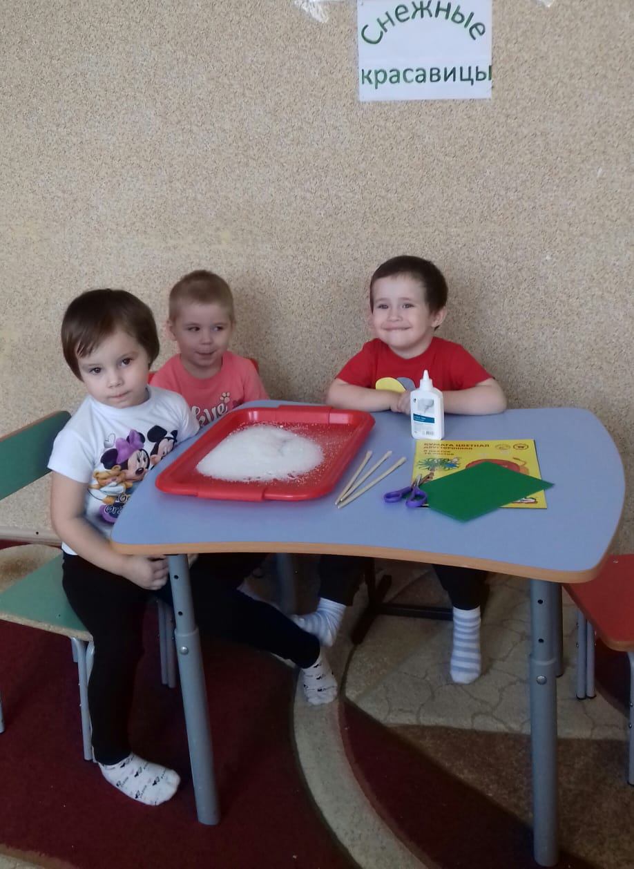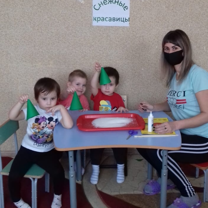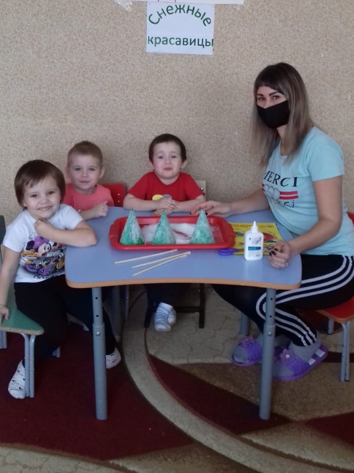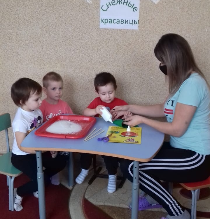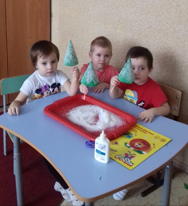 Сегодня воспитатель Сергеева К.А. с детьми выполнила работу "Снежные красавицы", где дети с помощью цветной бумаги, клея, деревянных палочек и соли сделали ёлочки. Малыши были очень заинтересованы, увлечены деятельностью и довольны своей работой.