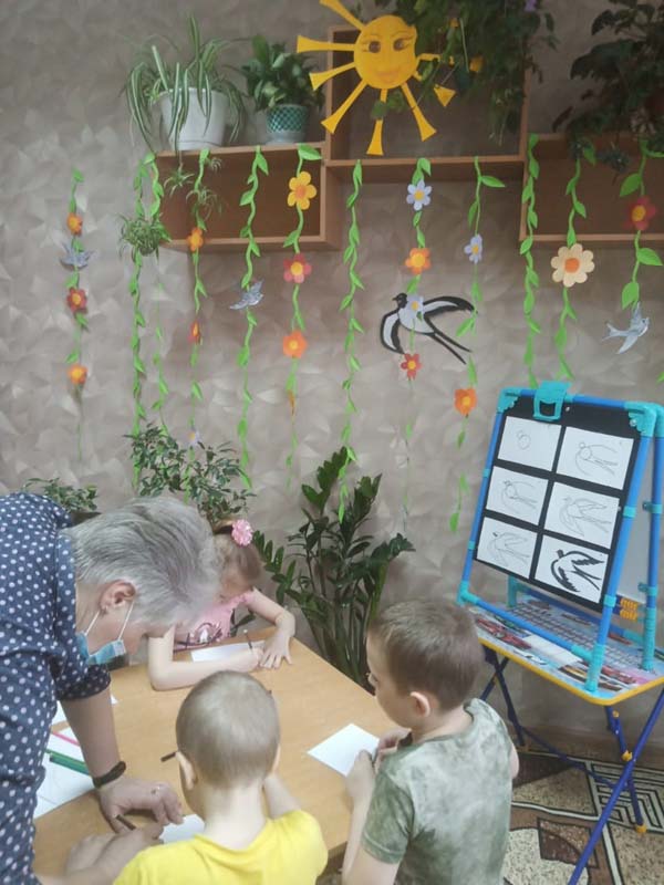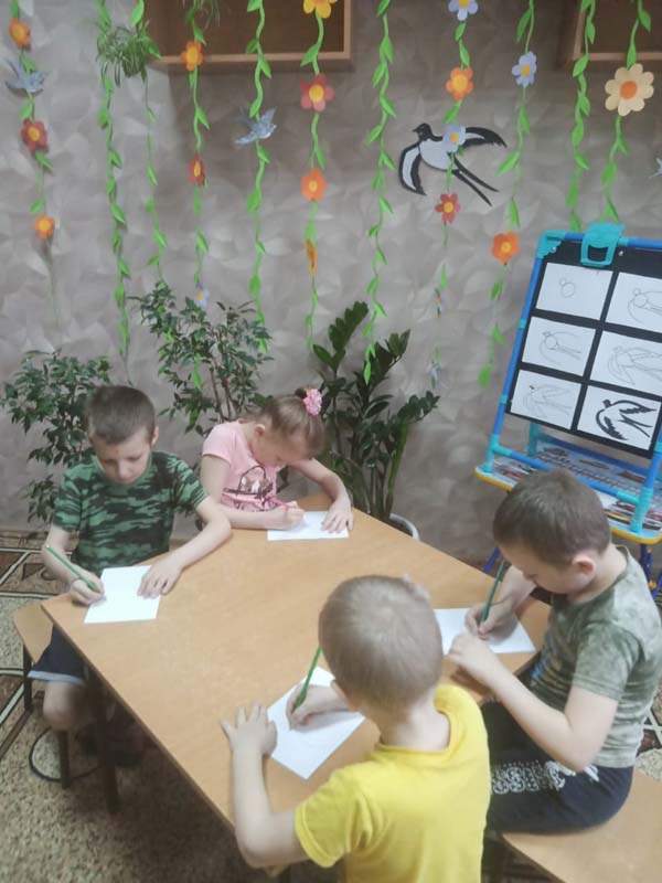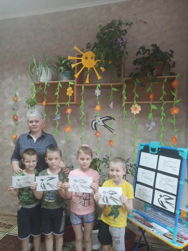 Рассмотрев птичку, воспитатель Щепотина Е.Н. предложила каждому ребенку нарисовать свою ласточку, поэтапно объяснив, как сделать правильный, а главное, красивый эскиз!