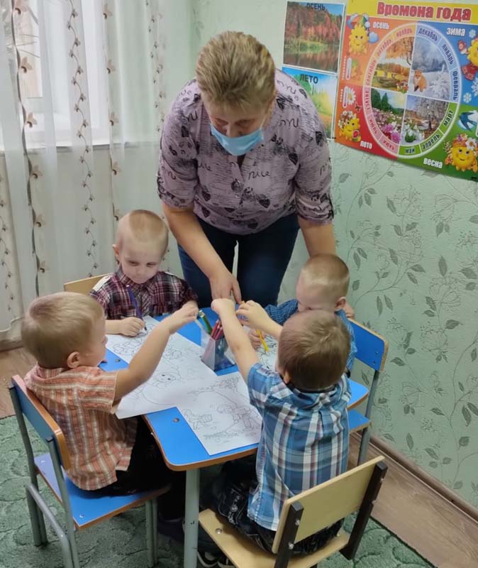 В процессе занятия были проведены игры: "Листопад", "Собери овощи и фрукты", физкультминутка "Ветер дует нам в лицо". А затем дети раскрасили картинки по теме "Времена года".