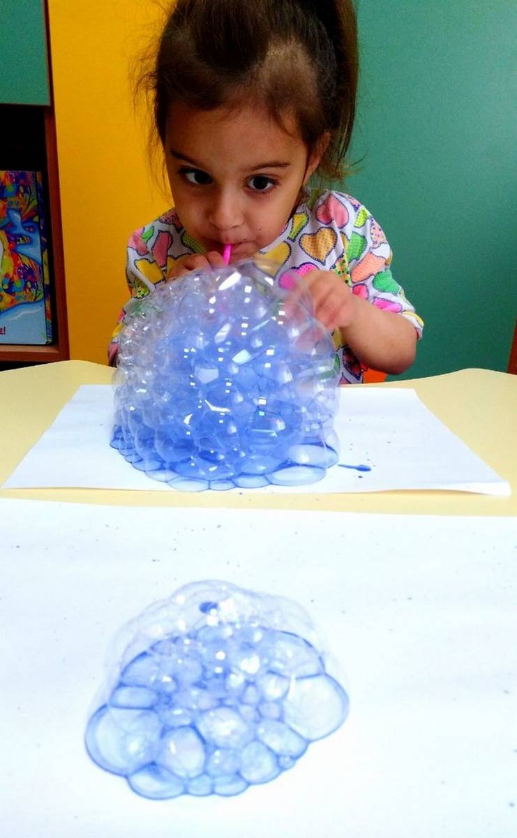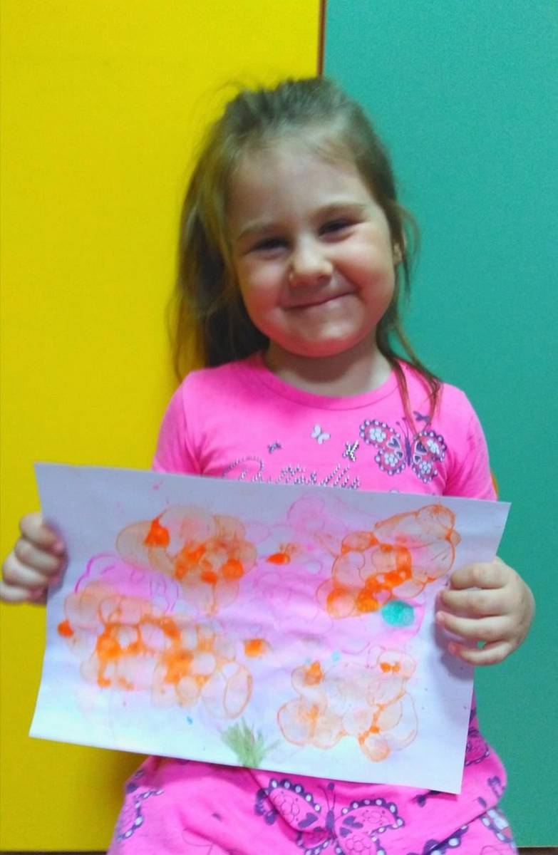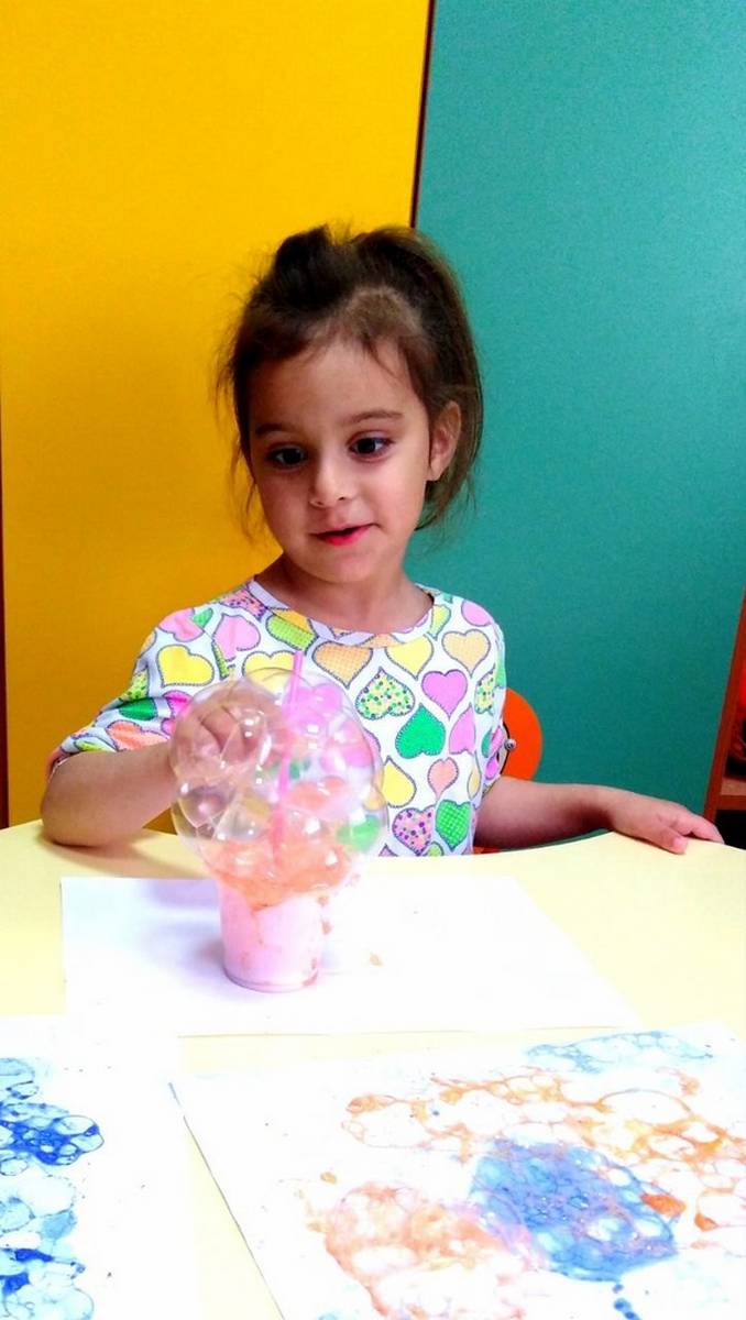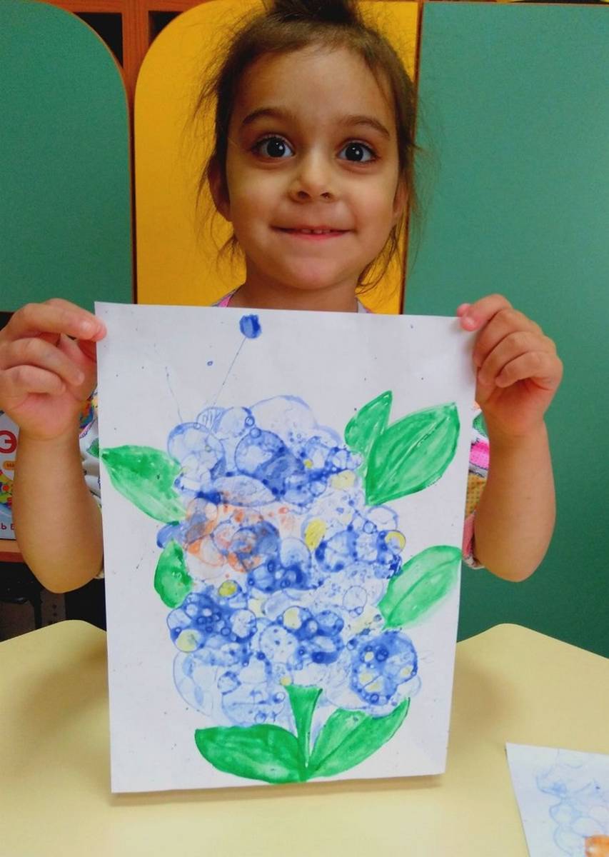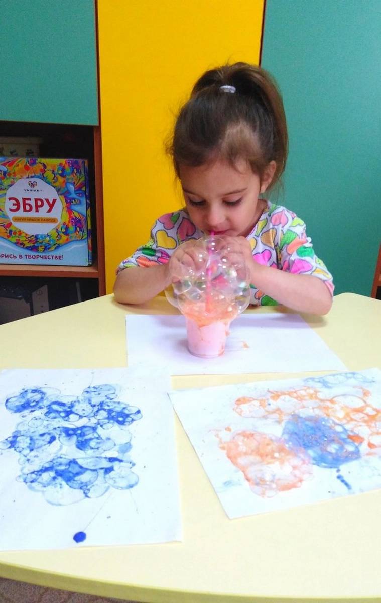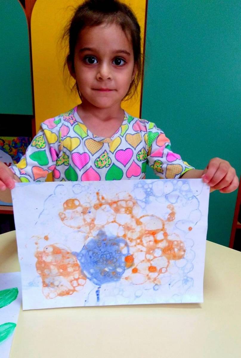 Рисунки получились самобытными, ни на что не похожими. А творческое занятие прошло очень весело. Цветные лопающиеся шары и обилие пены вызвали у детей восторг!