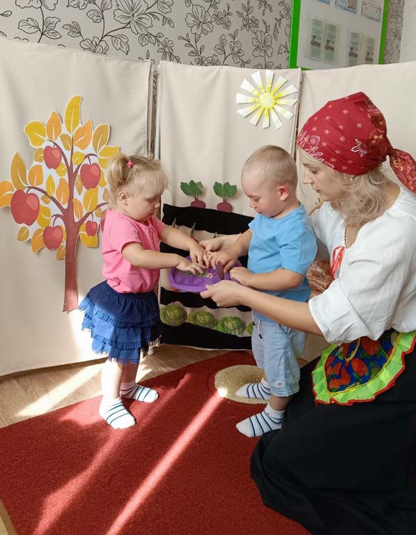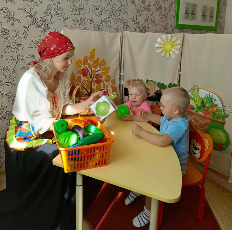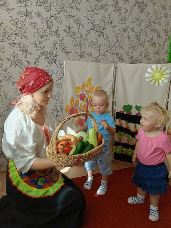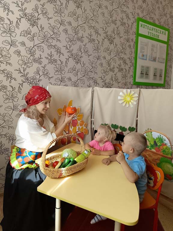 Для раннего периода развития ребенка характерен повышенный интерес ко всему, что происходит вокруг него. Основополагающую роль в познании малышами окружающего мира играют непосредственные действия, связанные с обследованием, изучением нового объекта, и взаимодействие с ним. На занятии «Овощная сказка» педагог-психолог Денисова Н.Н. проинсценировала познавательную сказку, героями которой стали овощи. Ребята с интересом играли, изучая при этом названия, вид и свойства овощей, активно участвовали в совместной деятельности.
