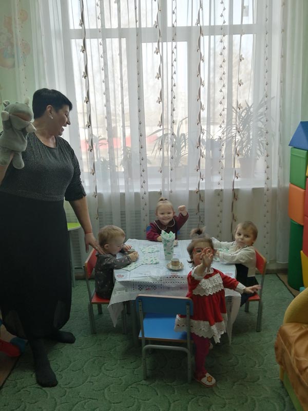 Наталья Михайловна с куклой Машей и носорожком из волшебного мешочка рассказала и показала детям простейшие правила личной гигиены в младшем возрасте. Дети учились умываться, чистить зубки, мыть ручки и сами накрывали стол для чаепития.