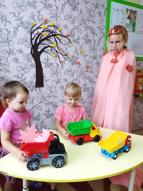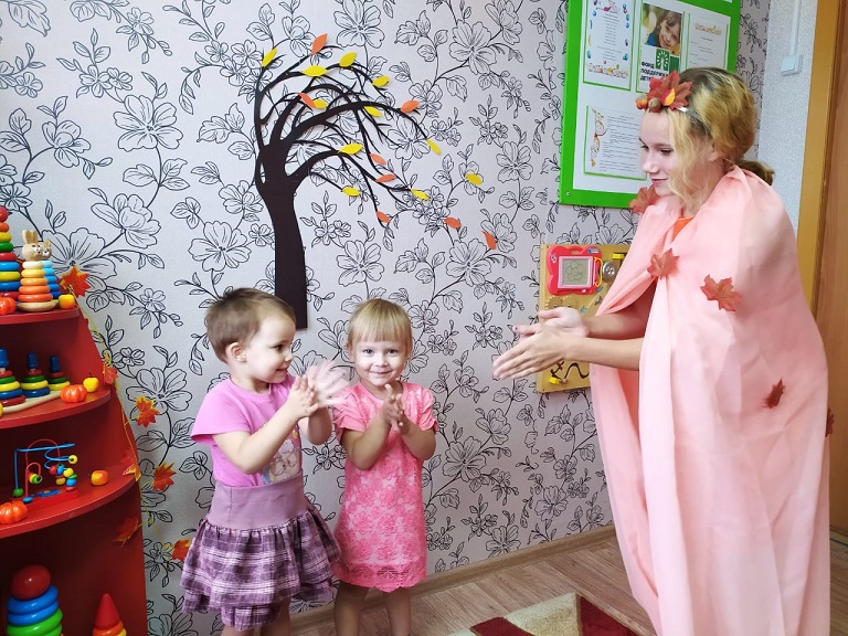 Началось занятие с "прихода" осени, которая вместе с детьми провела разминку "Согреем ладошки". Затем воспитанницы собирали листочки по цвету и с удовольствием сделали пальчиковую гимнастику "Листочки".