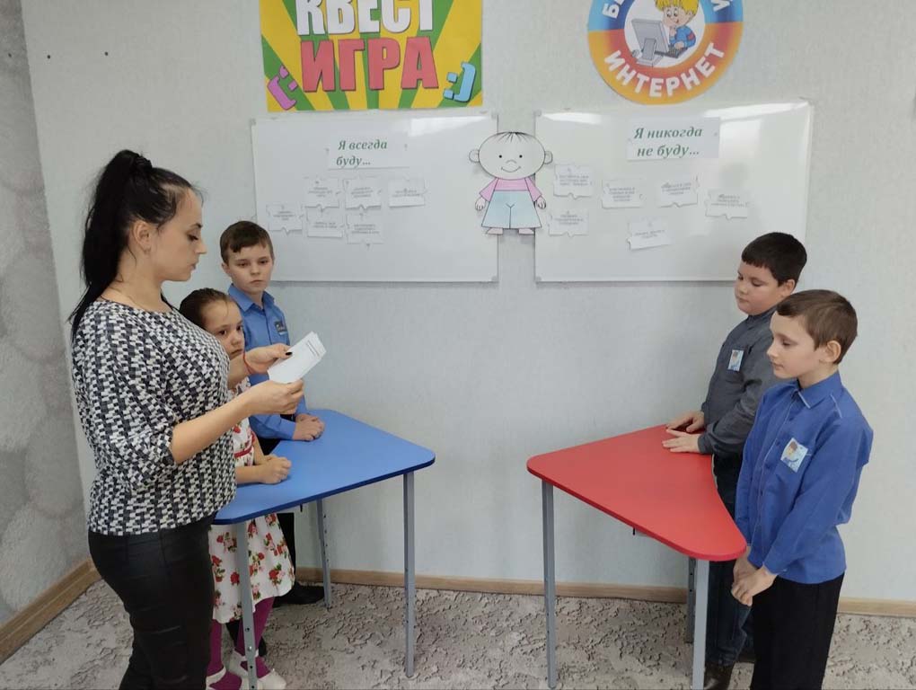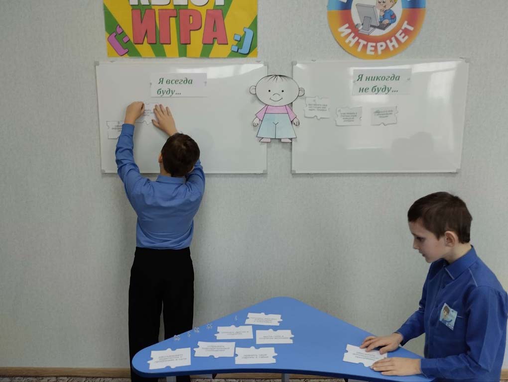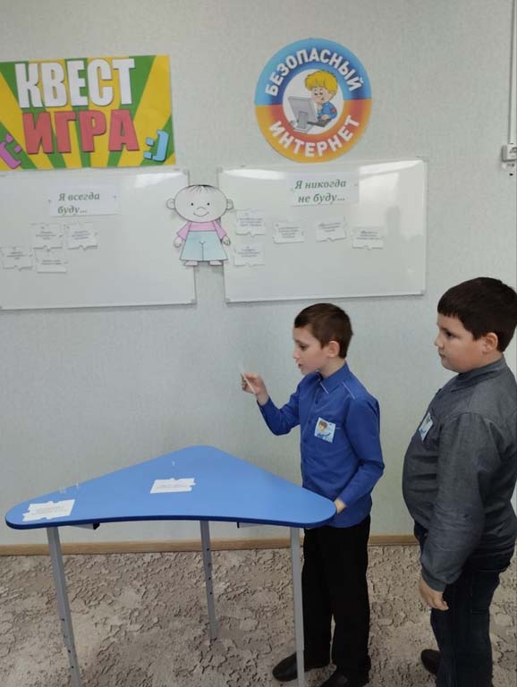 Среди ребят были сформированы две команды «Нетик» и «Сетевичок». Участникам игры предстояло пройти несколько этапов, которые посвящены правилам безопасного поведения во Всемирной Интернет сети. Ребята собирали пазлы, разгадывали «волшебные ребусы», из которых узнали, какие опасности могут подстерегать в Интернете. Вторым этапом участники квеста пытались найти правильный ответ на затруднительные ситуации: что делать, если тебя приглашают в неизвестную группу, незнакомец предлагает дружбу с последующей встречей и др. Следующим этапом квеста каждой команде было предложено написать письмо в определенном стиле по электронной почте на неизвестный участникам адрес. Задание направлено на выработку норм этического поведения в виртуальном общении. Дальше участники помогли виртуальному человечку разобраться, чего нужно опасаться при работе в Интернете. Используя кодовую таблицу, узнали, какую информацию нельзя сообщать в Интернете. Последним шагом в игре был просмотр мультфильма «Безопасный интернет».