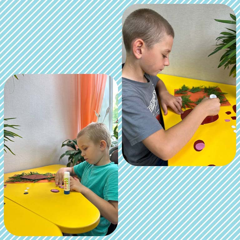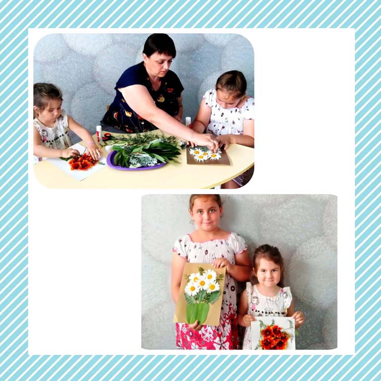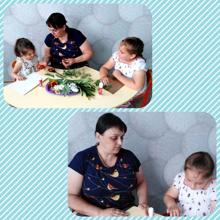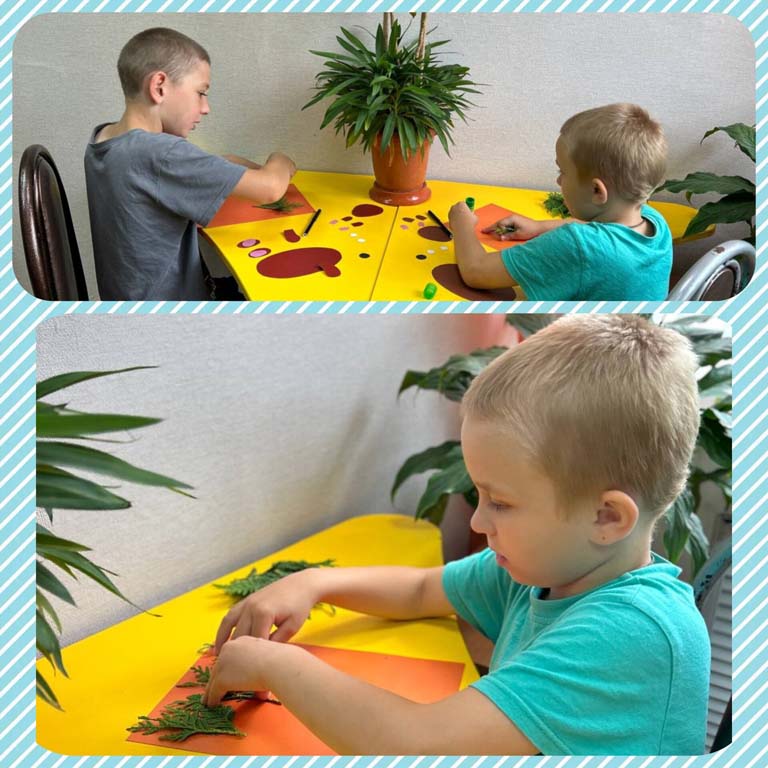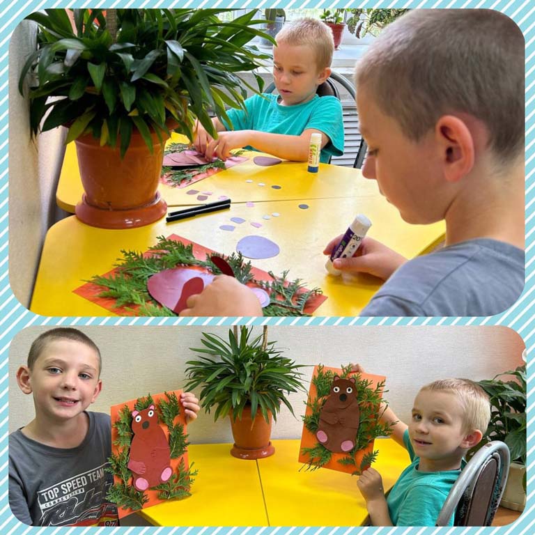 Затем в творческих мастерских ребята старшей и средней групп выполняли работы из природного материала. Такой материал является неиссякаемым источником творчества и вдохновения и заключает в себе большие возможности сближения ребенка с природой. Ребята увлечённо мастерили поделки «Медведь в лесу», «Цветочное вдохновение». Воспитанники, проявляя фантазию, использовали в своих работах богатую цветовую палитру лета. Творческий процесс очень увлёк детей. В результате ребята сделали оригинальные и красивые поделки.