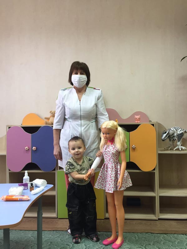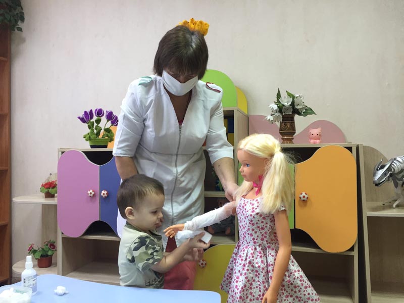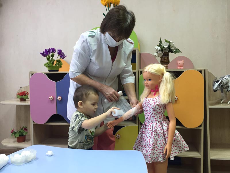 Ребёнок с интересом слушал, отрабатывал навык оказания первой помощи при травме.