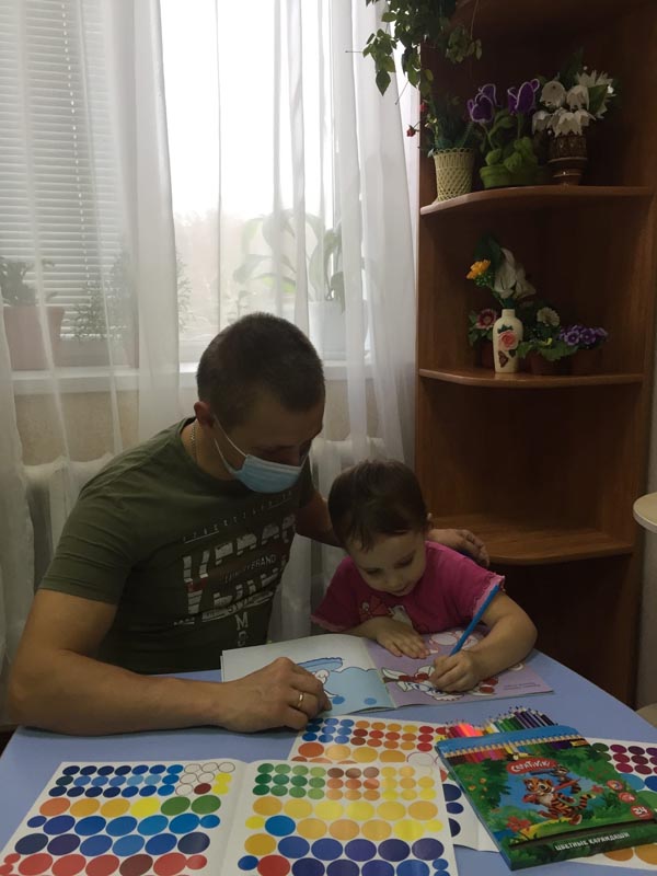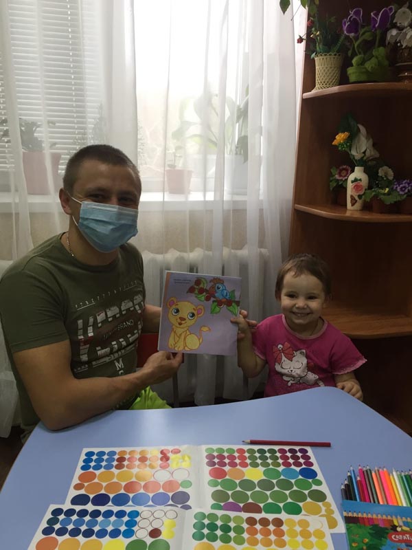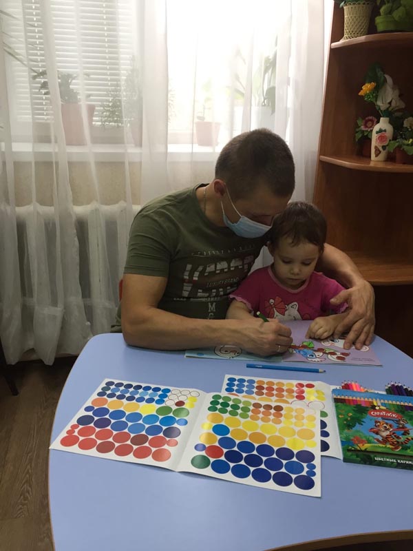Воспитатель Коробков Вячеслав Леонидович провёл занятие по сенсорному развитию восприятия. Он рассказал ребёнку о животных и местах их обитания. В ходе занятия ребёнок подбирал цвета в тон картинок и раскрашивал предложенные элементы, а также подбирал кружки по цвету и размеру и клеил их. Учился анализировать результат своей работы.
