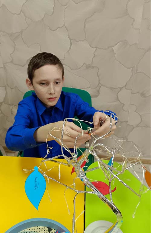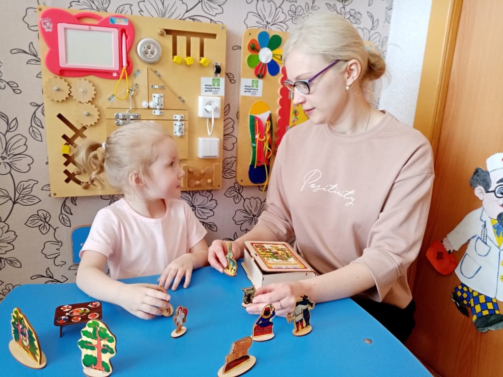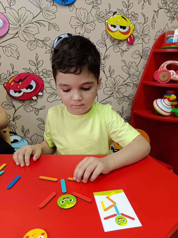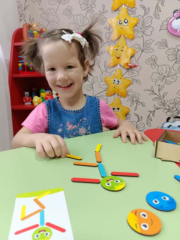 Во время очередного планового посещения учитель-дефектолог проводила развивающее занятие по обучению грамоте, где ребенок обучался чтению, запоминая буквы и их звучание, и письму, воспроизводя элементы письменной речи. Педагог-психолог организовала игру-«бродилку» «Несуществующее животное» — активность, в которой дети «передвигаются» по игровому полю, выполняя задания различной степени сложности и составляя в процессе образ необычного животного. Такая игра помогает развитию мышления, внимания, мотивации и социальной коммуникации.