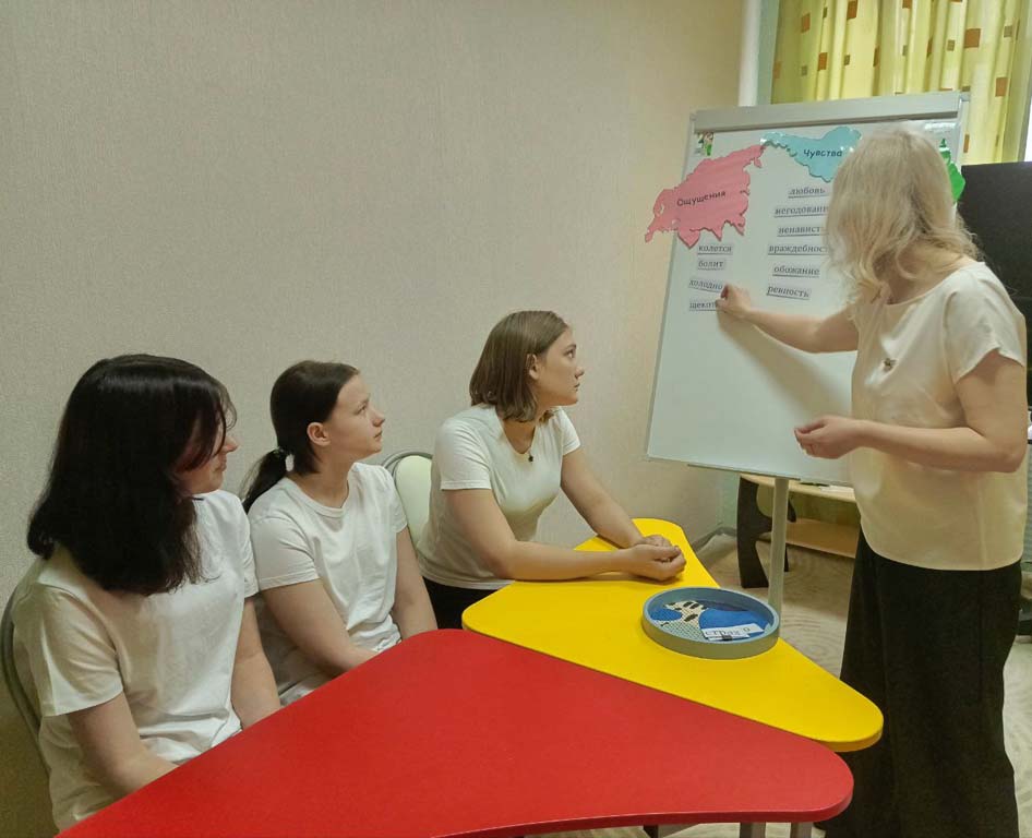 Развитие эмоциональной сферы происходит на протяжении всей жизни, однако проявление именно подростковых эмоций может вызывать множество вопросов и переживаний. Подростковый кризис часто усугубляется низкой способностью распознавания своих и чужих эмоций, а главное - неумением их контролировать. На занятии «Планета чувств» педагог-психолог Денисова Н.Н. обсудила с воспитанницами важность умения осознавать свое эмоциональное состояния, совместно отработали навыки управления эмоциями. Полученные знания помогут девочкам более эффективно справляться со стрессом, адаптироваться к новым условиям и выстраивать продуктивные отношения с окружающими.