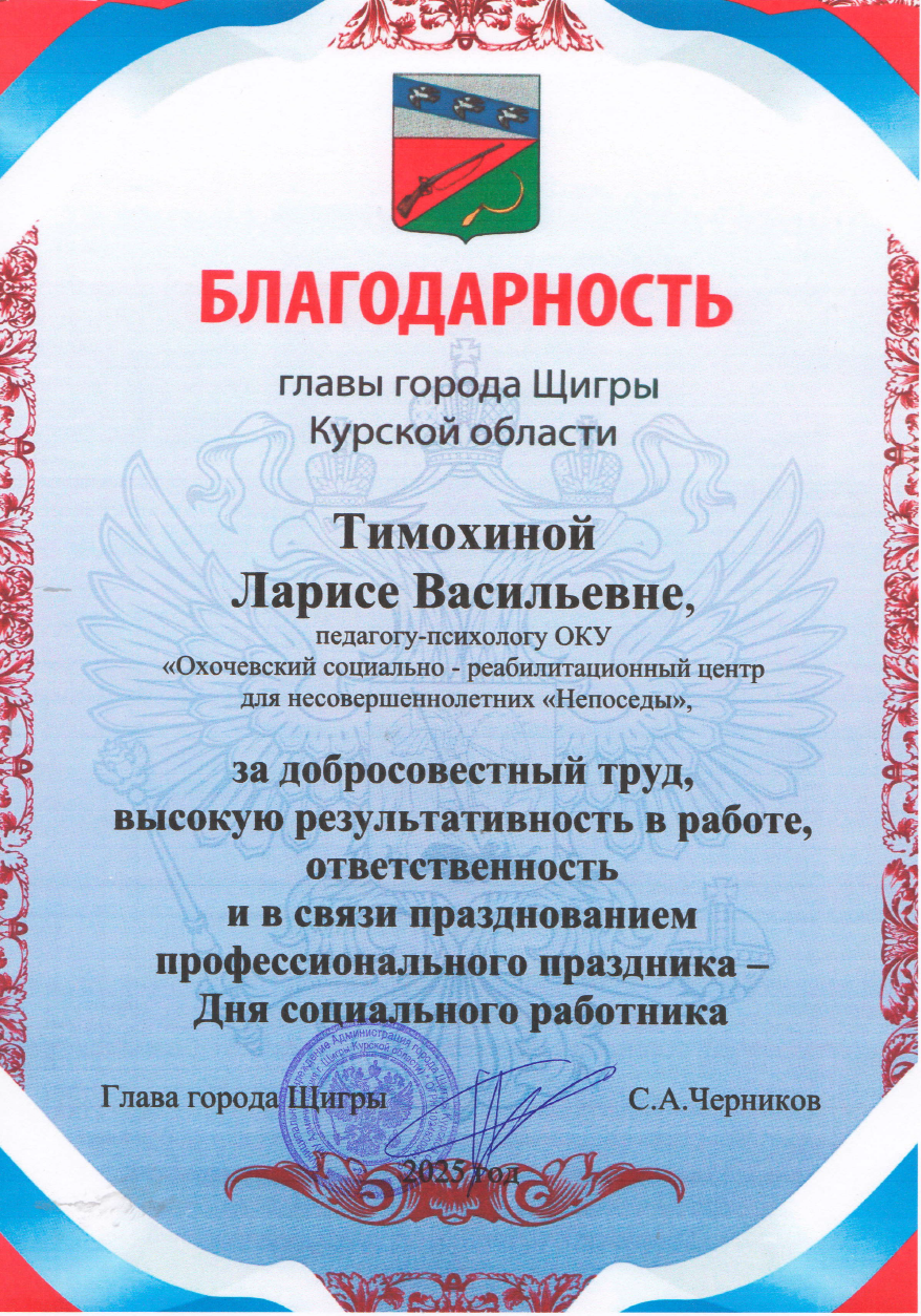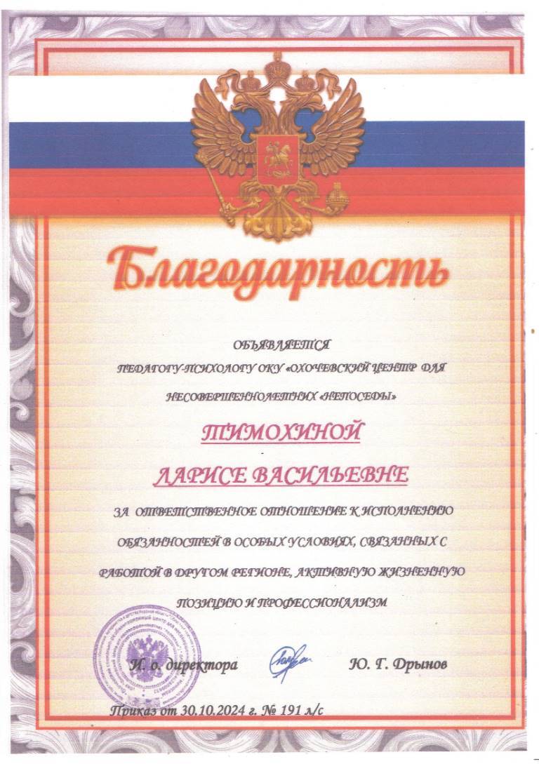 Заслуги и награды Благодарность 2024 Благодарность 2024 Благодарность 2025 Благодарность 2025 View the embedded image gallery online at: https://www.ohochevskiy-priyut.ru/index.php/videoportfolio-spetsialistov/119-pedagogi-psikhologi/288-pedagog-psikholog-timokhina-larisa-vasilevna/292-zaslugi-i-nagrady#sigProIdcb9c2122b0 > >