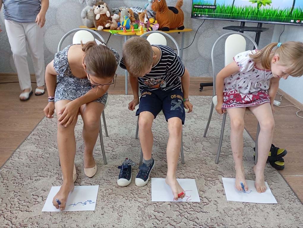 В ОКУ «Центр «Непоседы» педагог-психолог Тимохина Л.В. и музыкальный руководитель Голенищева С.А. провели занятие «Игры для босых ног». Под музыку воспитанники выполняли различные упражнения для ног: ходили по массажным квадратам, учились захватывать ногами мелкие игрушки, салфетки и перемещать их в кольцо, мять ножками комочки; играли пальчиками ног с цветными карандашами.