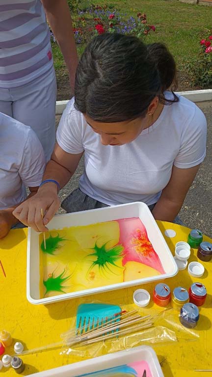Занятие началось с приветствия, где ребята с помощью смайлика донесли друг другу радостные эмоции от общения. На цветных ладошках были написаны положительные качества, которые ребята видят друг в друге. После этого были нарисованы страхи и тревожность, которые впоследствии превратились в прекрасные рисунки с помощью упражнения «Страшный и прекрасный рисунок». Свои эмоции ребята отразили с помощью рисунков на воде «ЭБРУ», подаренных спонсорами. Завершился тренинг релаксацией «Комплекс релаксационных методов и упражнений для преодоления тревожности «Гармония».