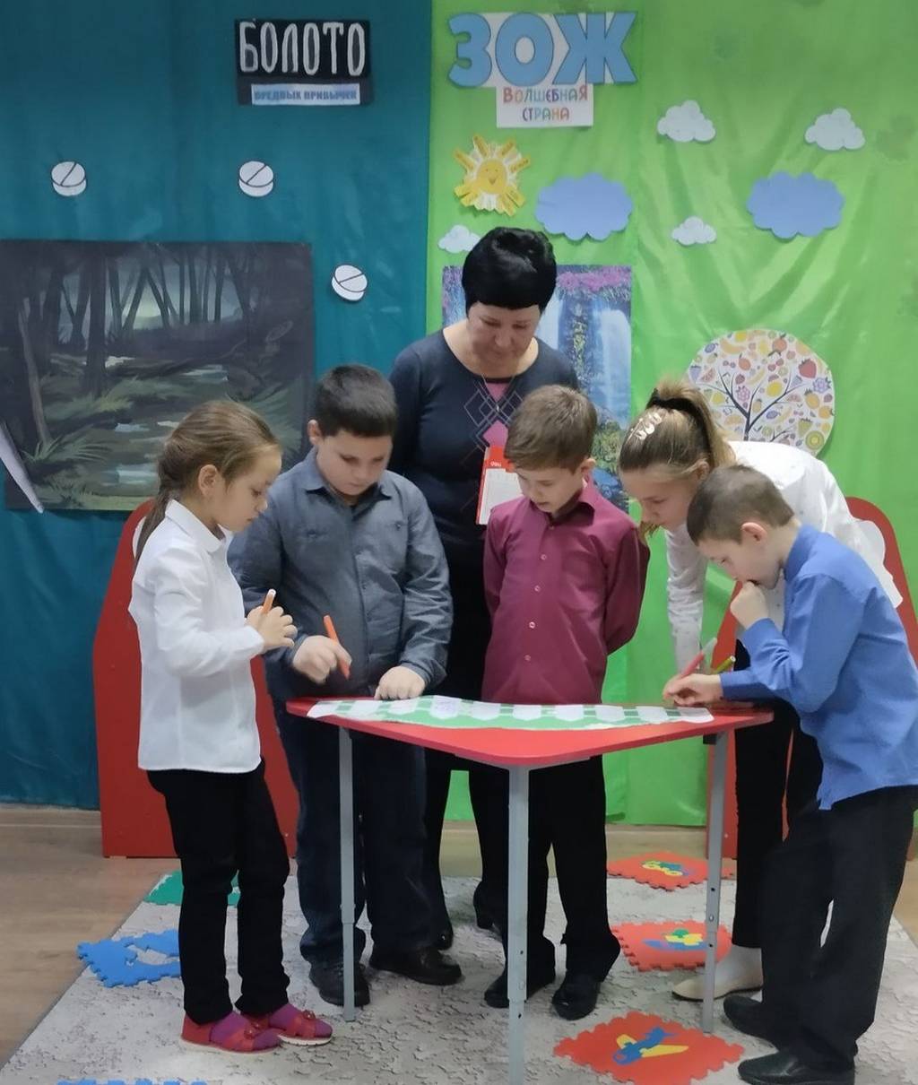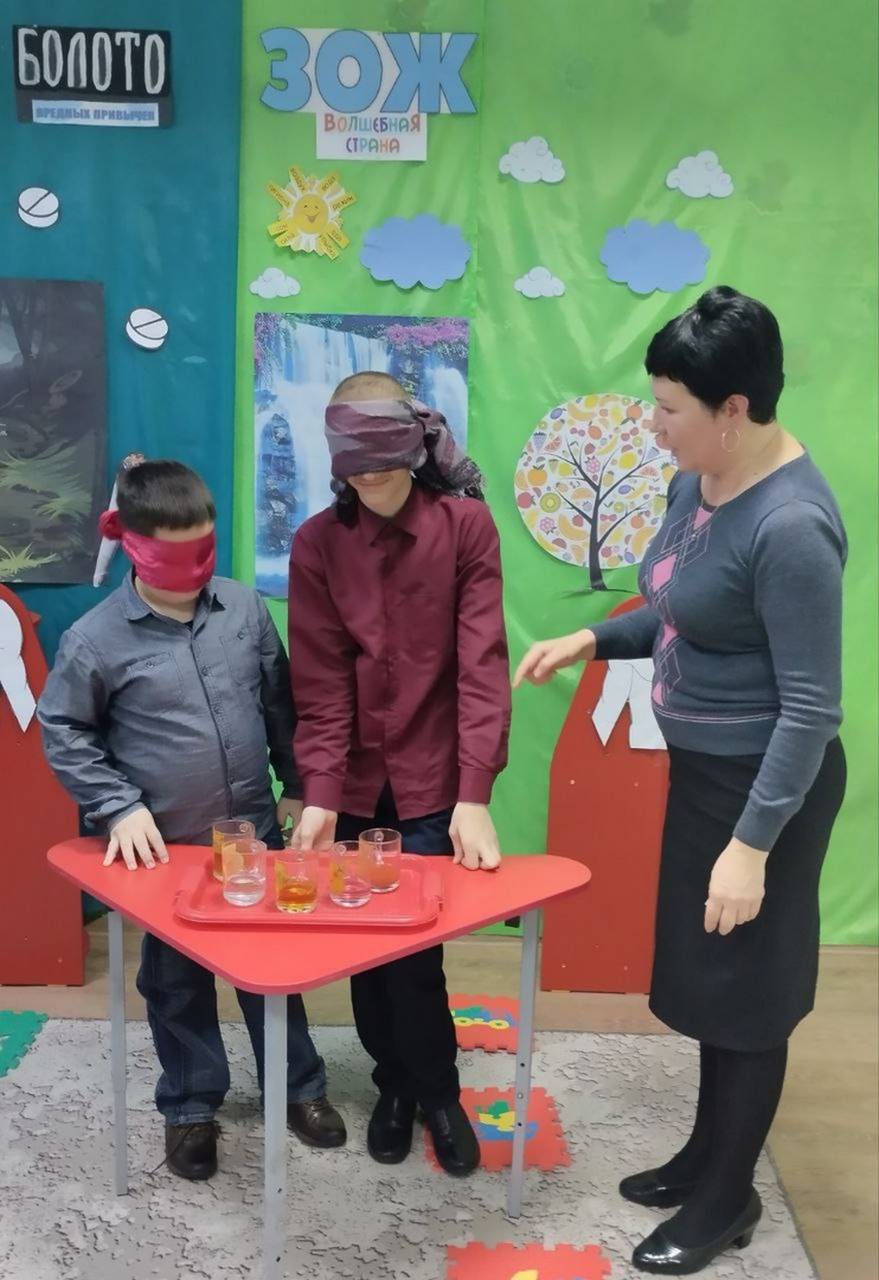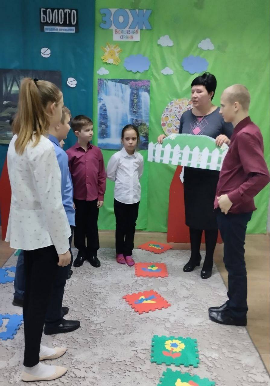 Ребята побывали в «Болоте вредных привычек» и «Волшебной стране ЗОЖ». Чтобы выбраться из болота, им пришлось искать альтернативу вредным привычкам. А в стране ЗОЖ насладиться вкусами и запахами фруктов, витаминных напитков. На макете человека сравнивали состояние внутренних органов больного и здорового человека.