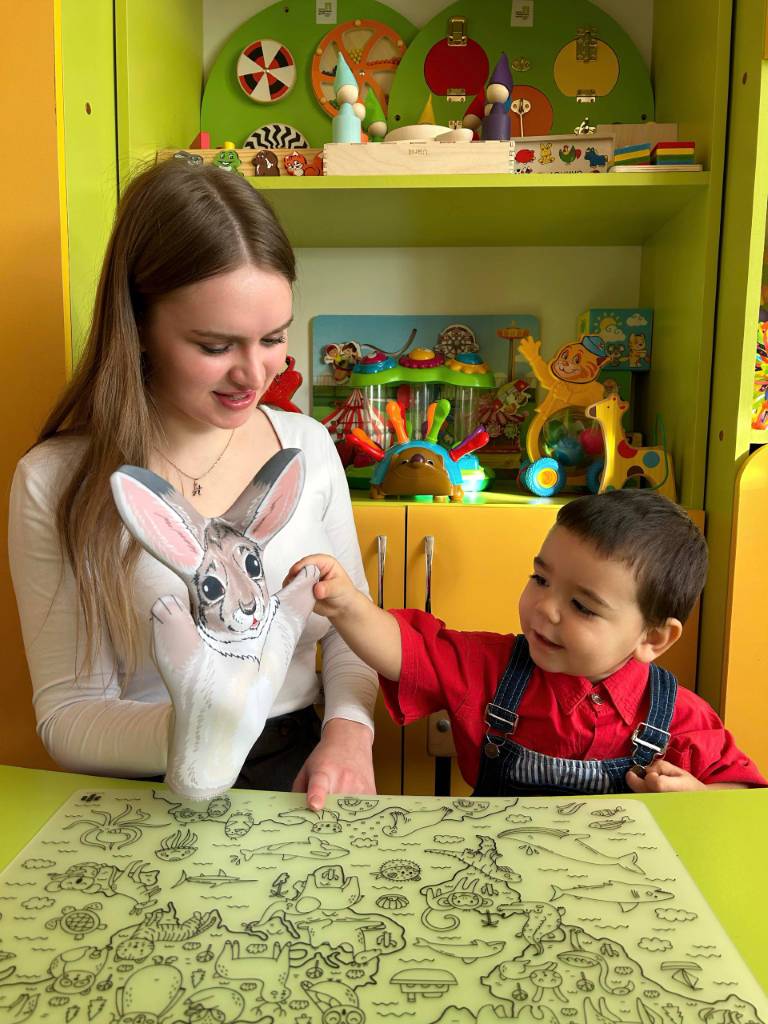 На занятии у учителя-дефектолога воспитанник младшей группы встретился с Зайкой и его «волшебной» Каплей, что позволило создать увлекательную игровую атмосферу для комплексного развития ребёнка. С помощью Зайки Малыш повторял названия частей тела и показывал их на собственном теле - такая работа способствовала закреплению лексики и развитию пространственного восприятия. Через игру «Тучка» активно развивалось речевое дыхание - ребёнок учился контролировать поток воздуха, а это важно для правильного произношения и речевой активности. Прослушивание воспитанником стихотворения Агнии Барто «Зайка» помогло развить навыки восприятия на слух, внимание и эмоциональный отклик. Кроме того, выполняя задание - нужно было спрятать зайца под зонтик, - ребёнок оттачивал игровые навыки, учился ориентироваться в простых сюжетных действиях.