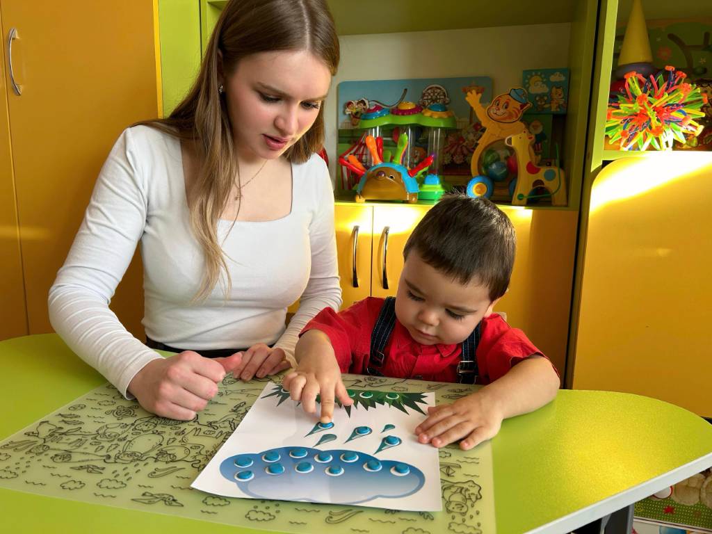 Воспитанники центра «Непоседы» регулярно посещают занятия, которые проводит учитель-дефектолог Н.Е. Самойлова. Особое внимание педагог уделяет развитию устной речи и стимулированию когнитивной и игровой активности у детей младшего возраста. На индивидуальном занятии «Аквабум» мальчик играл в игры и выполнял упражнения по развитию моторики, внимания, мышления и воображения. Ребенок улучшал навыки узнавания геометрических фигур и формировал правильное речевое дыхание в процессе игр.