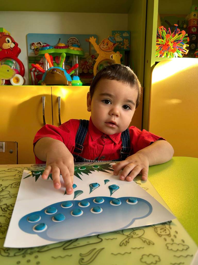 Воспитанница училась соединять части изображения, что способствовало развитию внимания, восприятия и логического мышления. Работа с прищепками помогла укрепить мелкие мышцы рук и улучшить координацию движений пальцев. Упражнения с наклонами и приседаниями на сенсорных ковриках способствовали развитию равновесия, гибкости и общей двигательной активности.